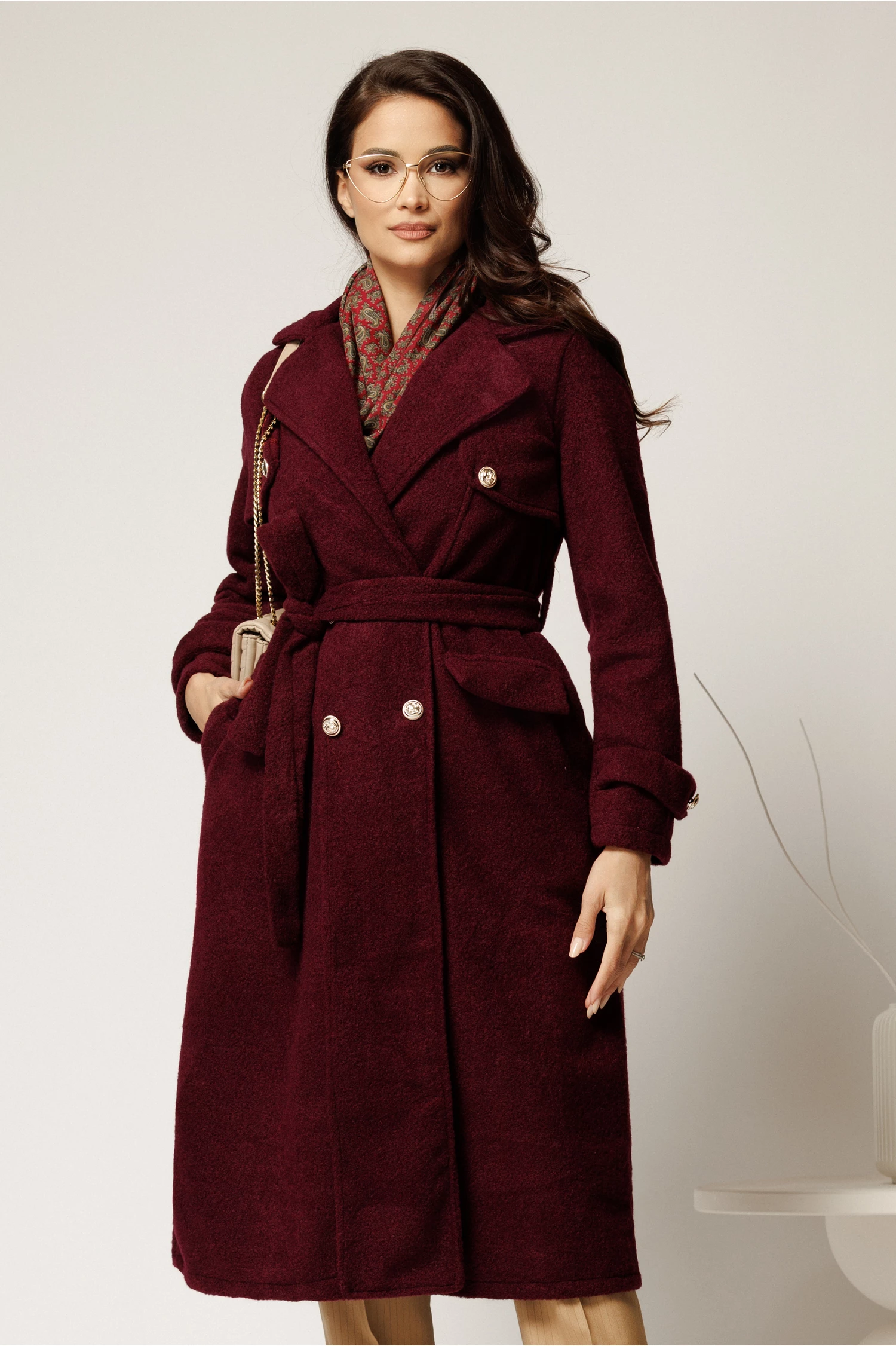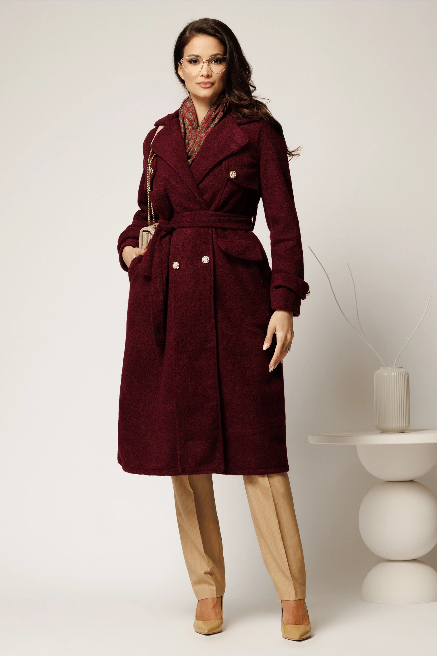 Palton de toamna din bucle cu doua randuri de nasturi si cordon detasabil in talie. Are rever clasic, maneci lungi, croi drept si buzunare functionale.