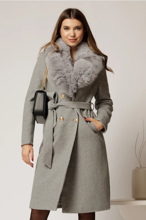 Este un palton elegant de dama, de culoare gri, a carei talie este evidentiata de un cordon elegant si are si inchidere cu nasturi.