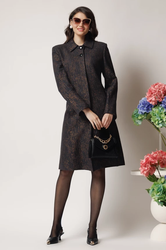 Palton elegant din lana cu fir lurex. Are guler ascutit, tip camasa, maneci lungi, croi cambrat, buzunare functionale si se inchide cu nasturi ascunsi.