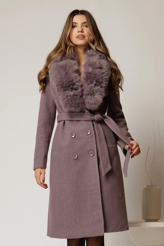 Este un superb palton lila, al carei croi drept avantajeaza orice silueta. Are gulerul accesorizat cu blanita, inchidere cu nasturi si cordon in talie.