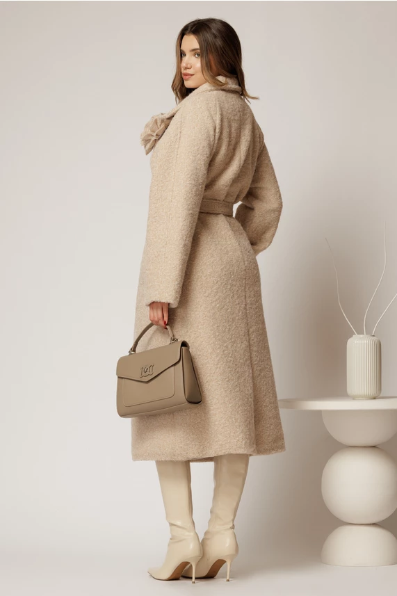 Palton lung elegant din bucle cu brosa pe bust si cordon detasabil in talie. Are decolteu in V petrecut, rever clasic, maneci lungi, buzunare functionale si nu prezinta inchidere.