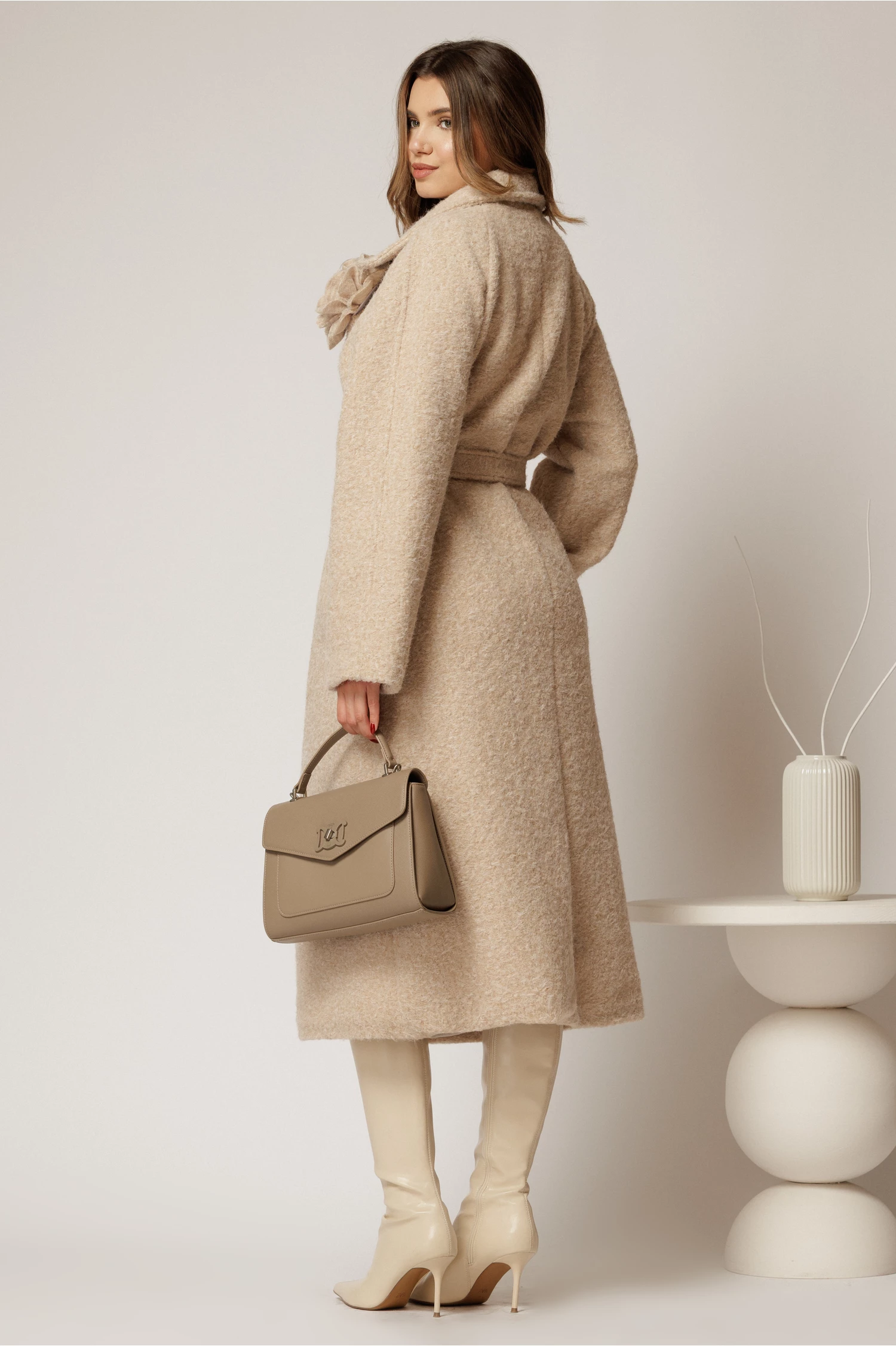 Palton lung elegant din bucle bej cu floare pe bust si cordon in talie