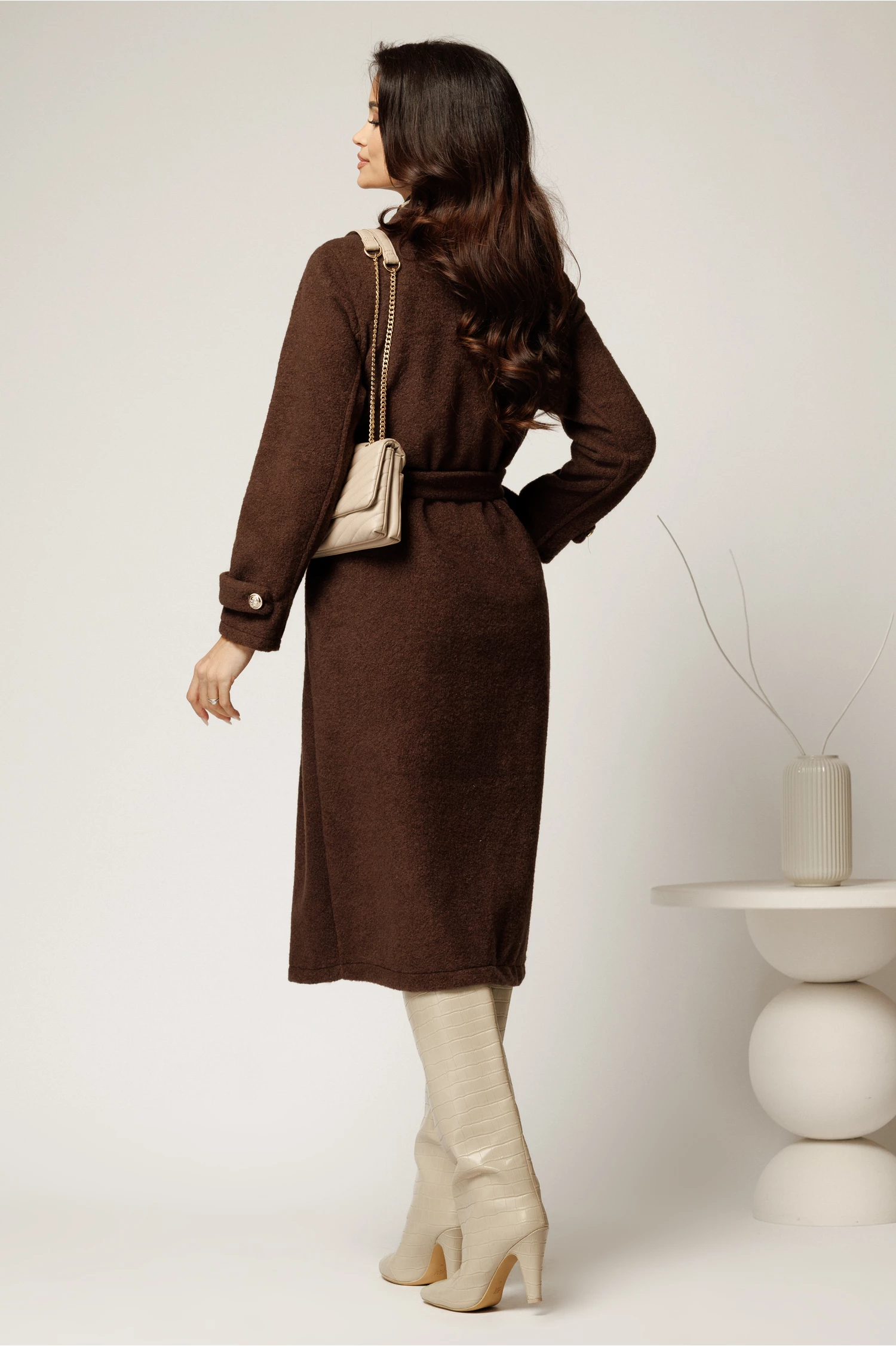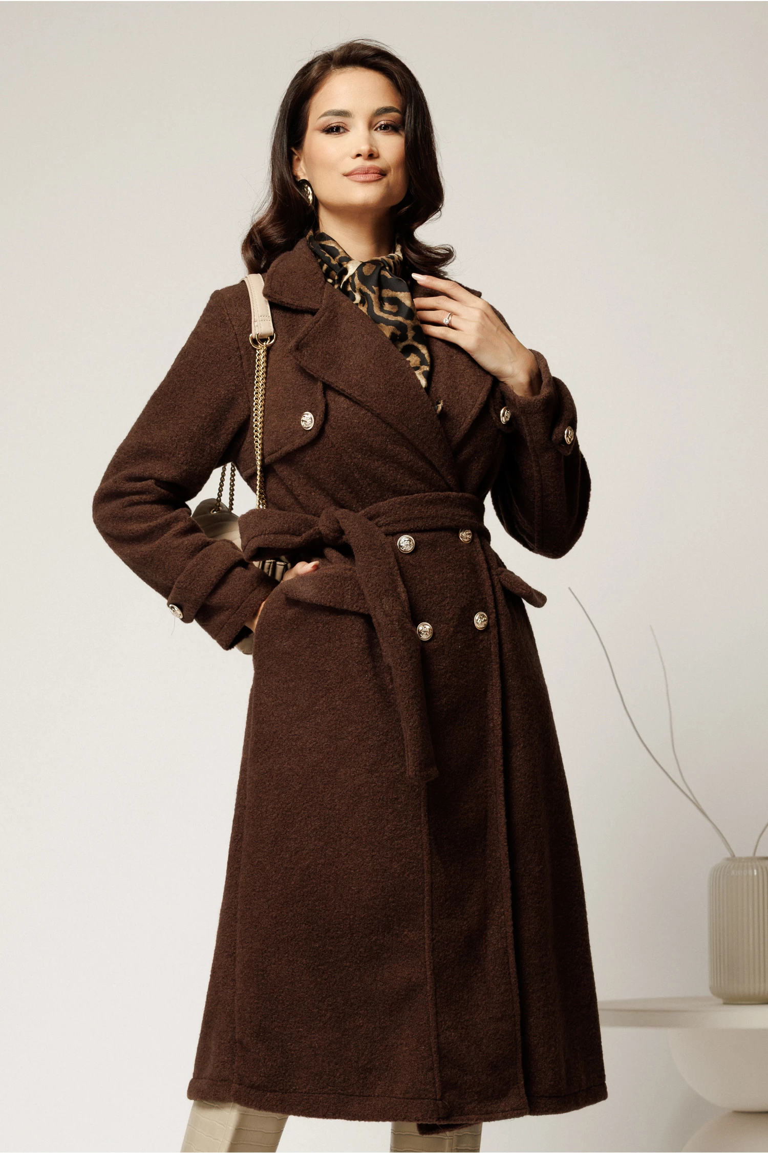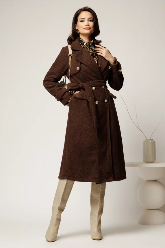 Palton maro din bucle cu nasturi si cordon in talie