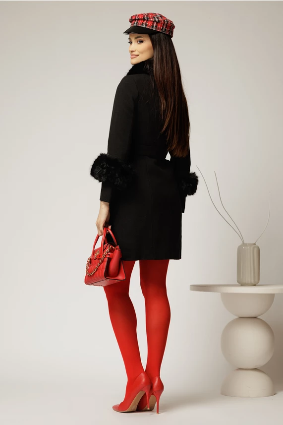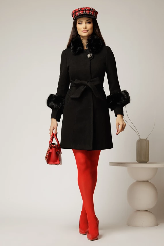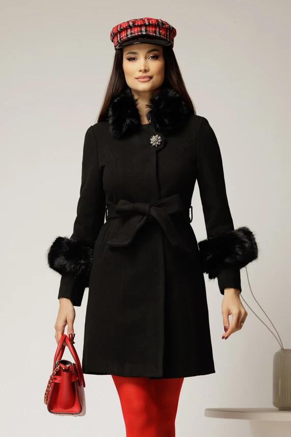 Palton negru din lana cu blanita detasabila si cordon in talie