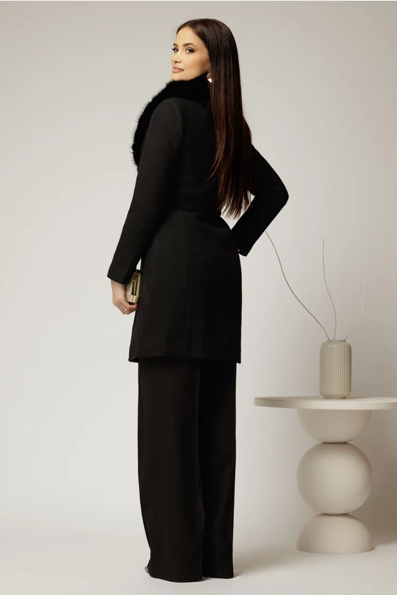 Este un palton elegant de culoare neagra, accesorizat cu brosa cu pietre si blanita detasabila la guler.