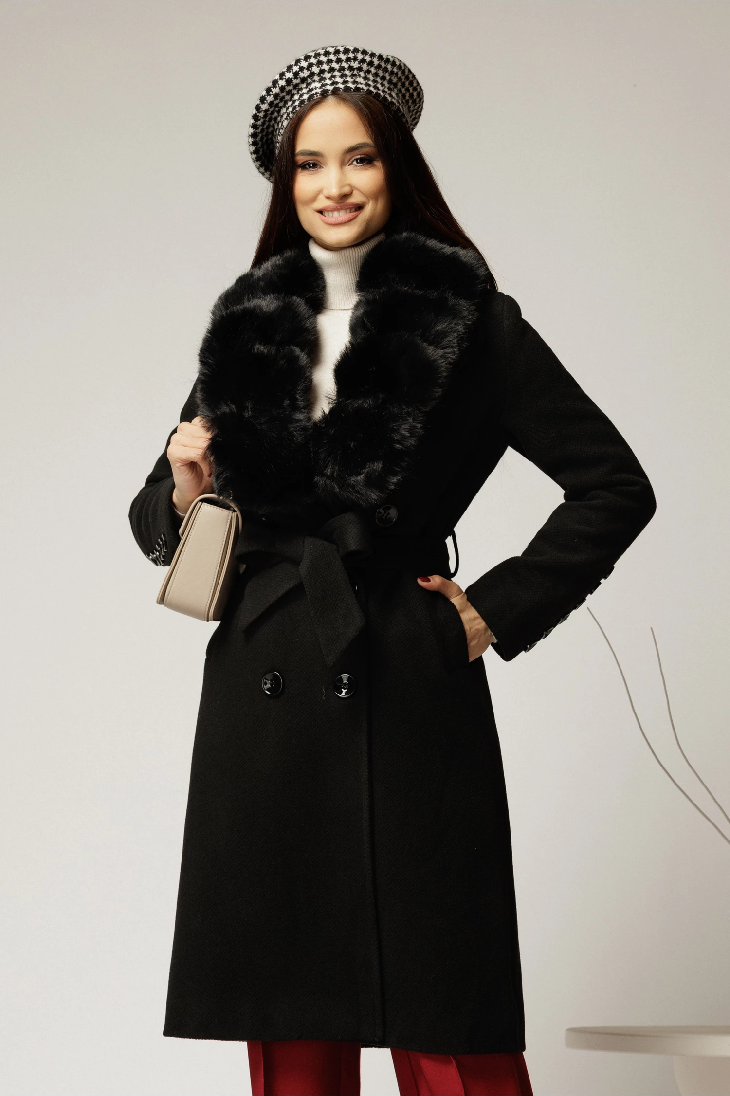 Este un superb palton negru, al carei croi drept avantajeaza orice silueta. Are gulerul accesorizat cu blanita, inchidere cu nasturi si cordon in talie.