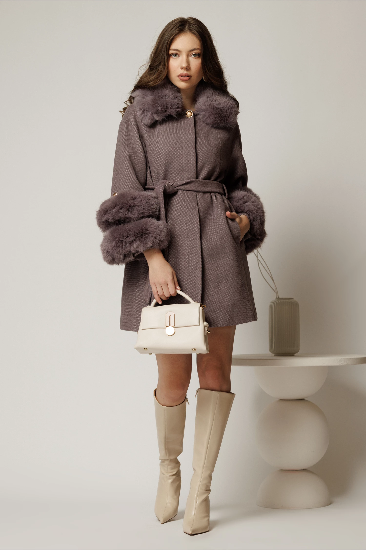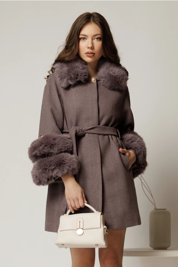 Este un palton scurt elegant, de culoare lila, cu blanita detasabila la guler si maneci. Are inchidere cu nasturi ascunsi si cordon in talie.