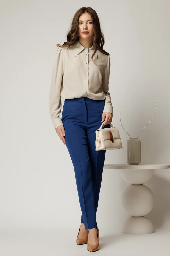 La birou alege sa porti o pereche de pantaloni albastri din stofa, comozi si confortabili. Croiul conic avantajeaza orice silueta si sunt usor de asortat si purtat.