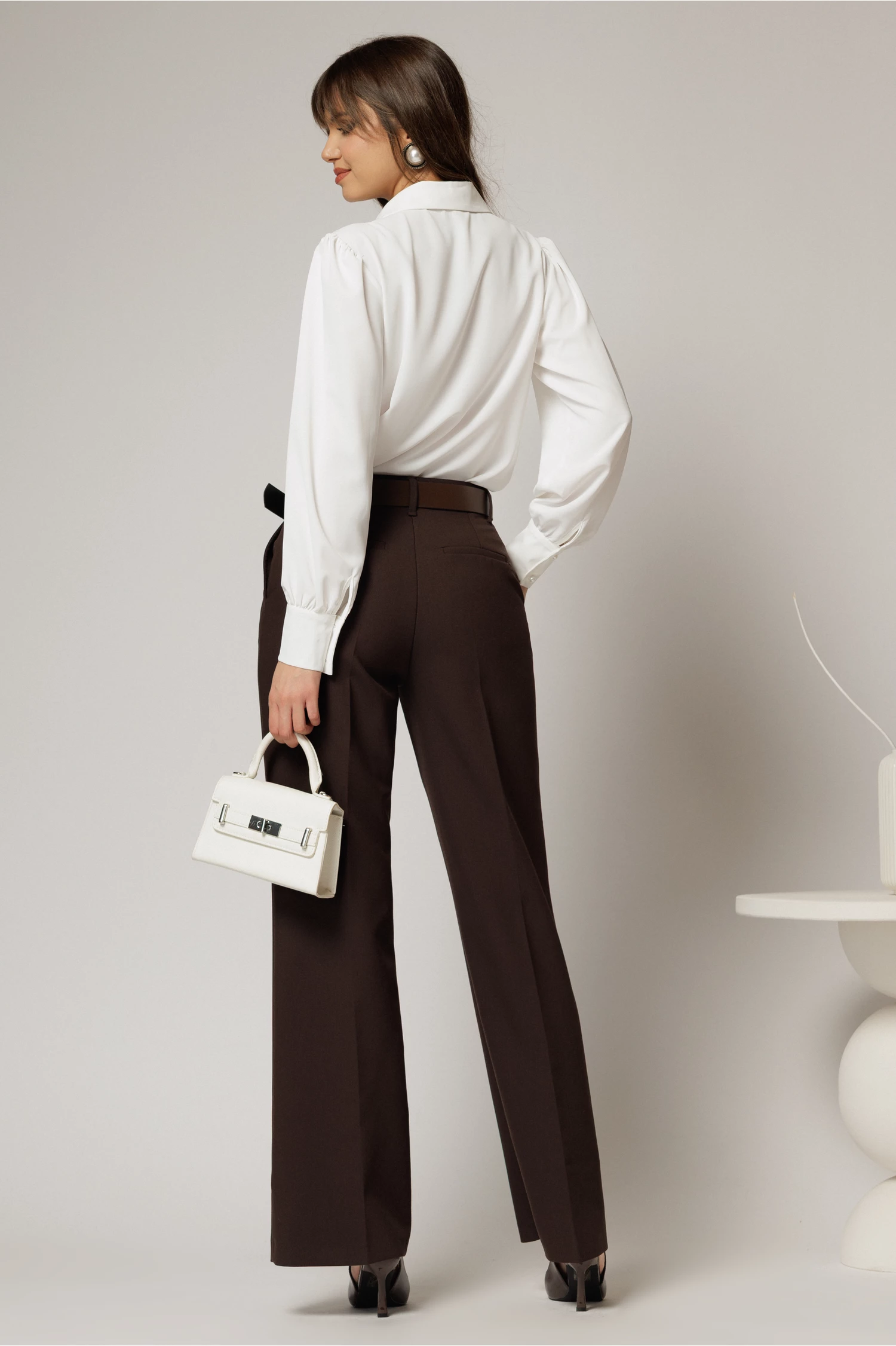 Alege o pereche de pantaloni maro inchis pentru zile usoare la birou, in care sa te simti confortabil. Pantalonii au buzunare laterale si curea in talie.