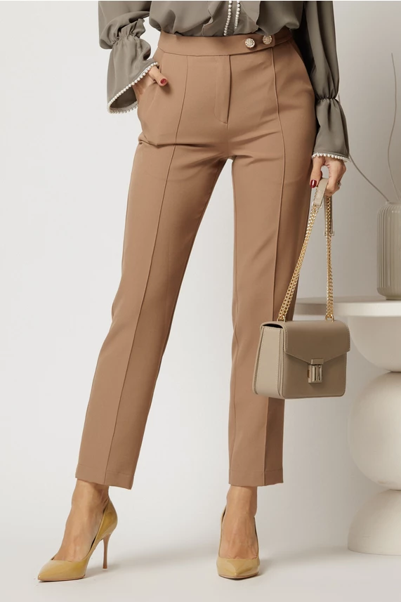 Pantaloni DY Fashion bej conici din stofa cu nasturi eleganti