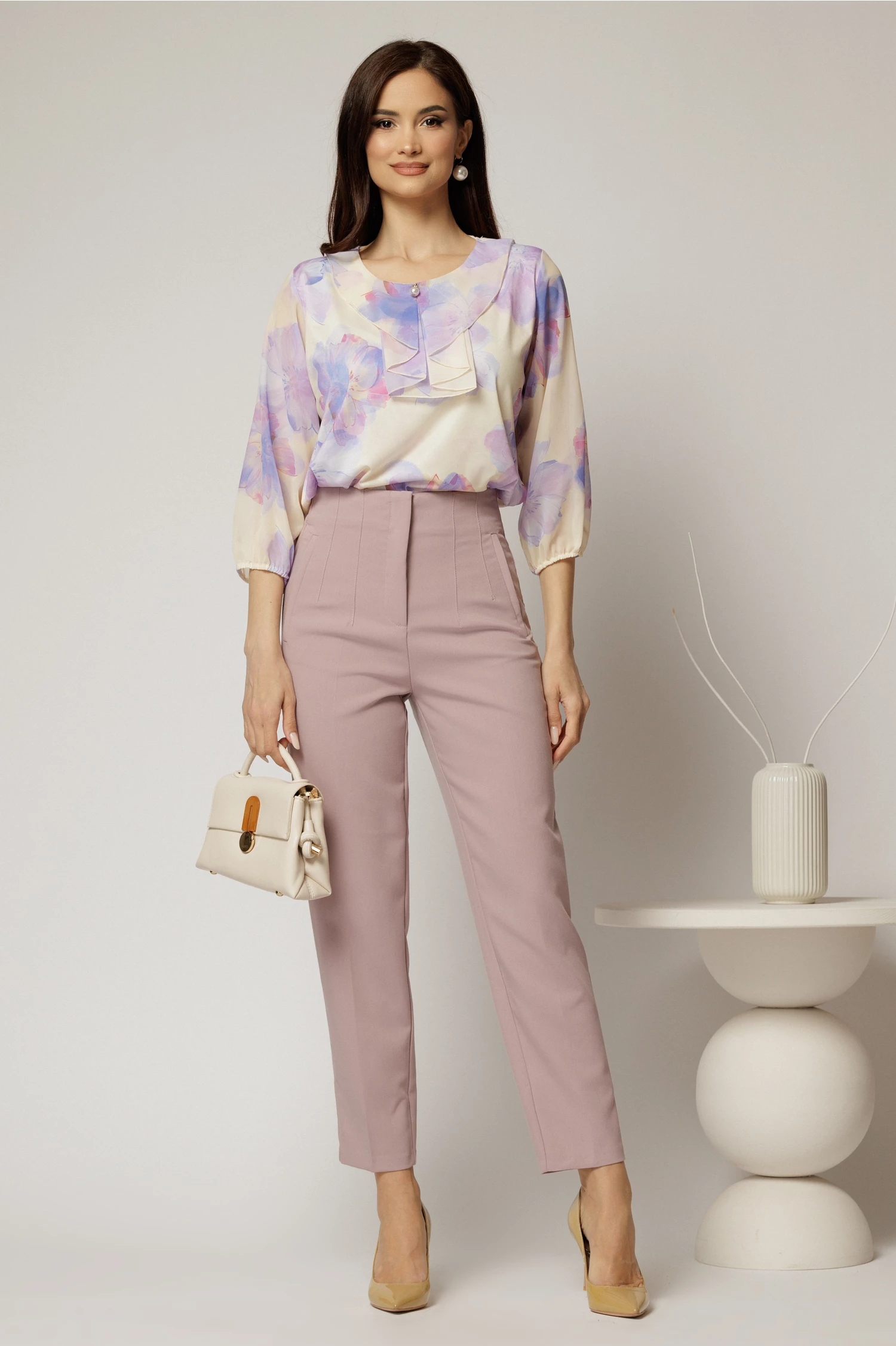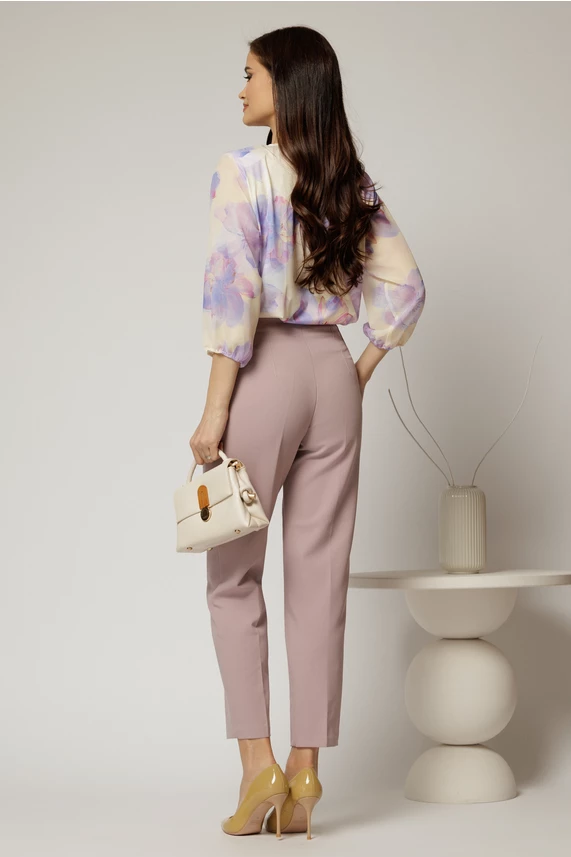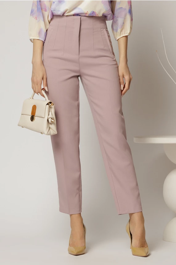 Zile senine cu o pereche de pantaloni lila roze, conici, cu pense si talie inalta.