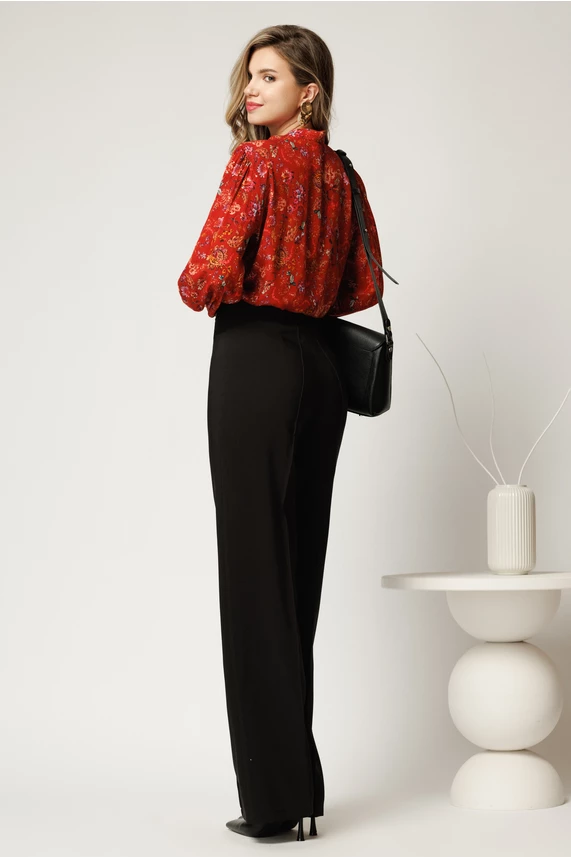Pantaloni office din stofa neagra cu dunga. Au talie inalta, croi evazat si se inchid cu nasture si fermoar.