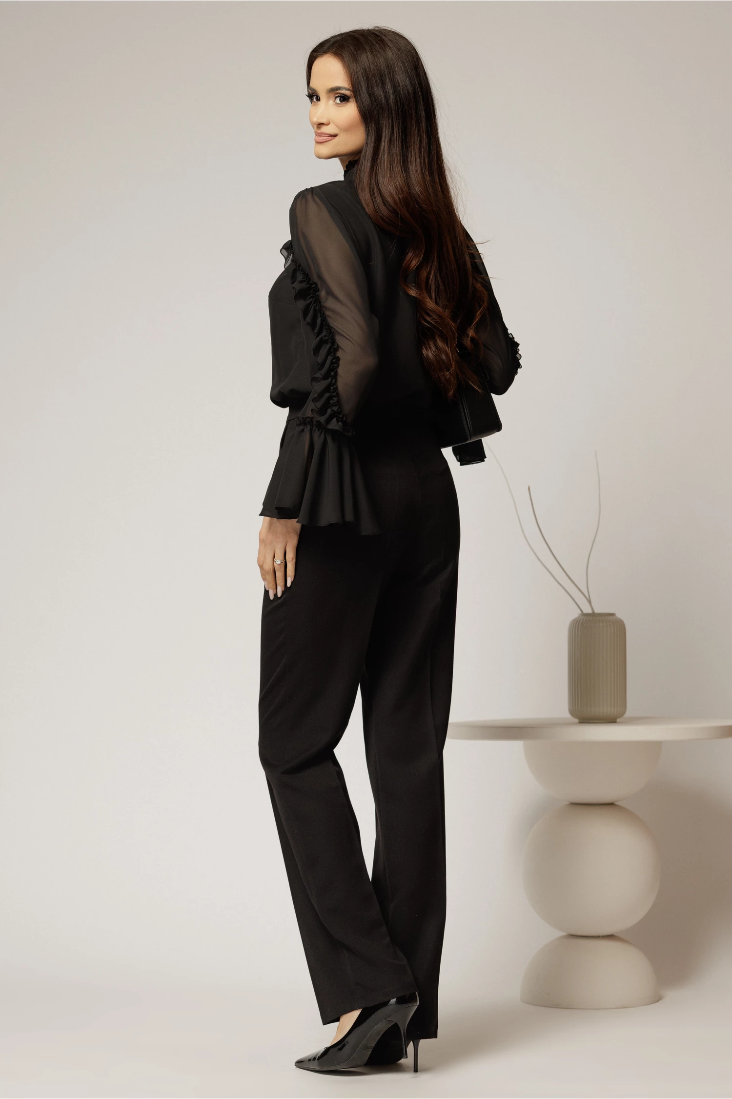 Alege un pantalon negru din stofa cu croiul pana si inchidere cu nasture.