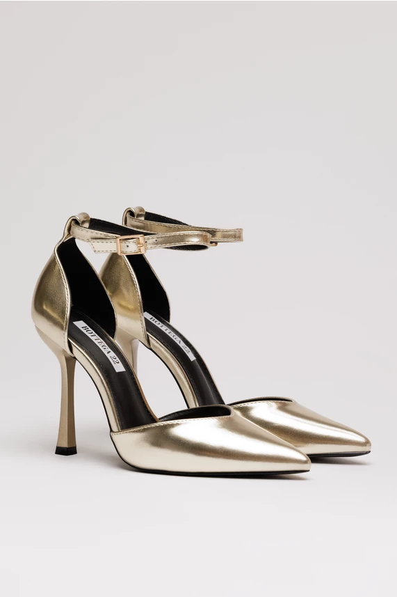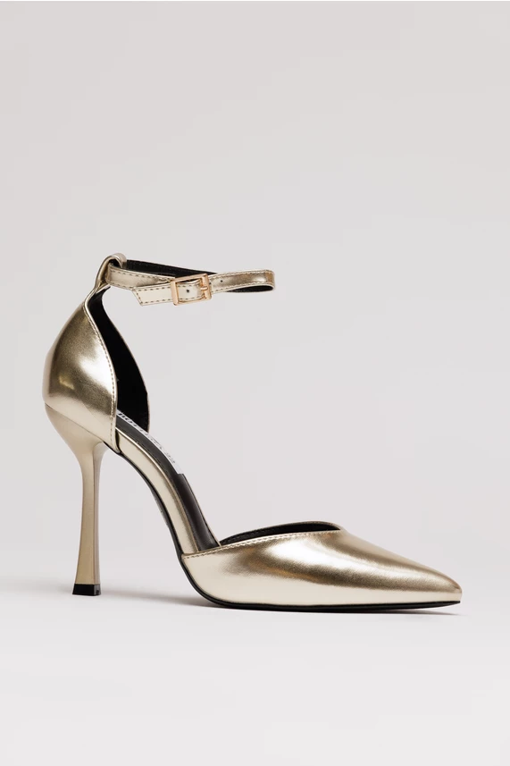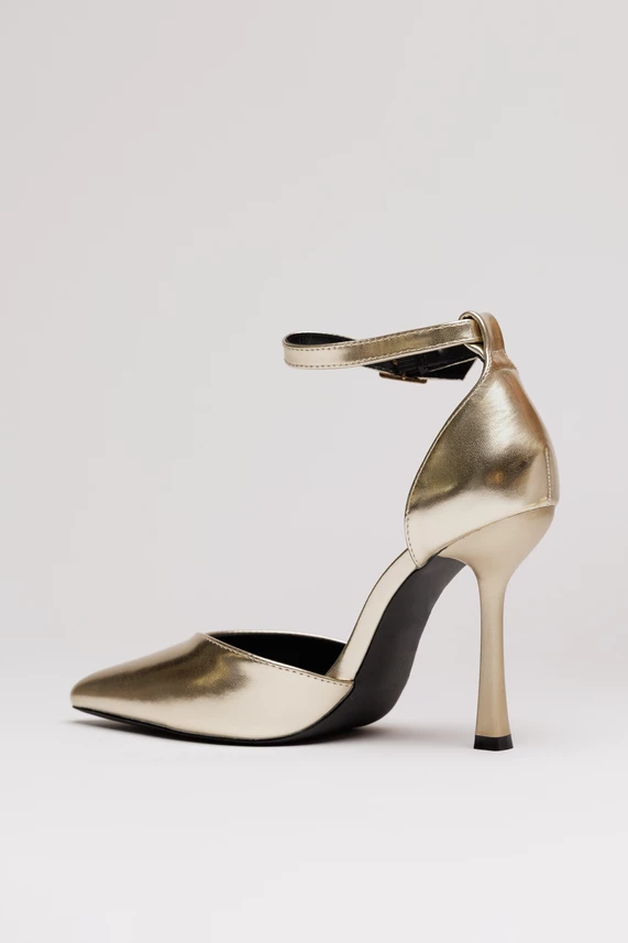 Pantofi eleganti aurii din piele ecologica . Au varf ascutit, decupaje pe laterale si bareta reglabila la glezna.