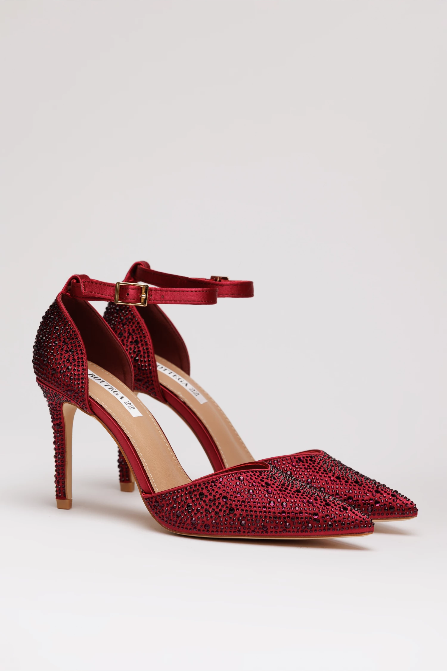 Pantofi de ocazie bordo cu toc subtire si aplicatii stralucitoare. Au varf ascutit, decupaje pe lateral si bareta reglabila la glezna.