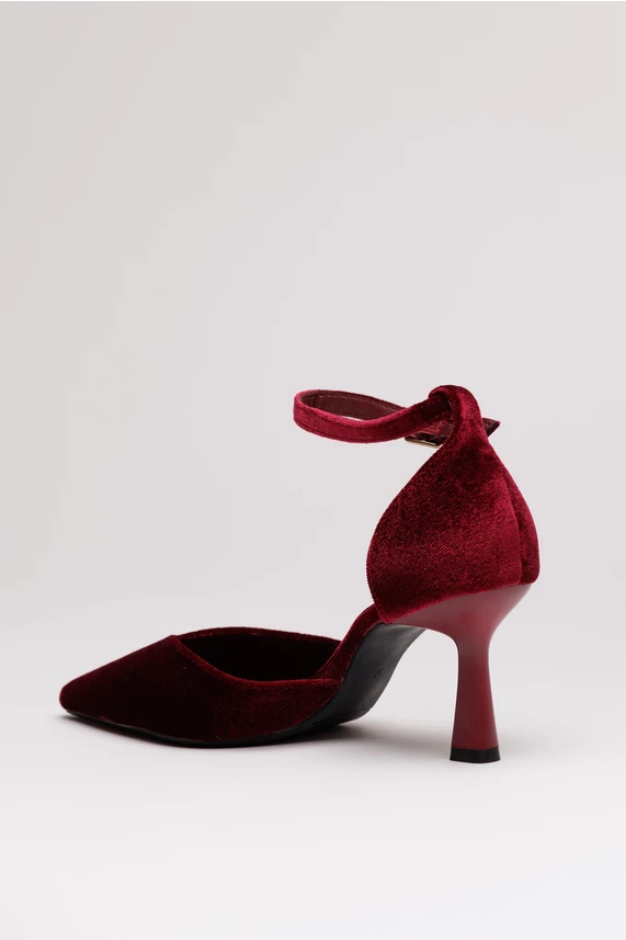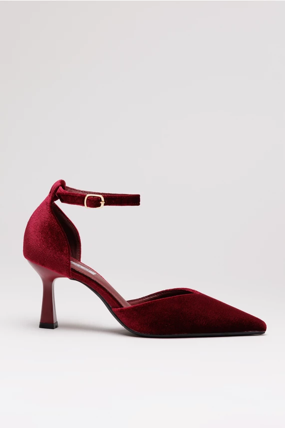 Pantofi eleganti din material catifelat. Au varf ascutit, toc jos si baretuta subtire la glezna.
