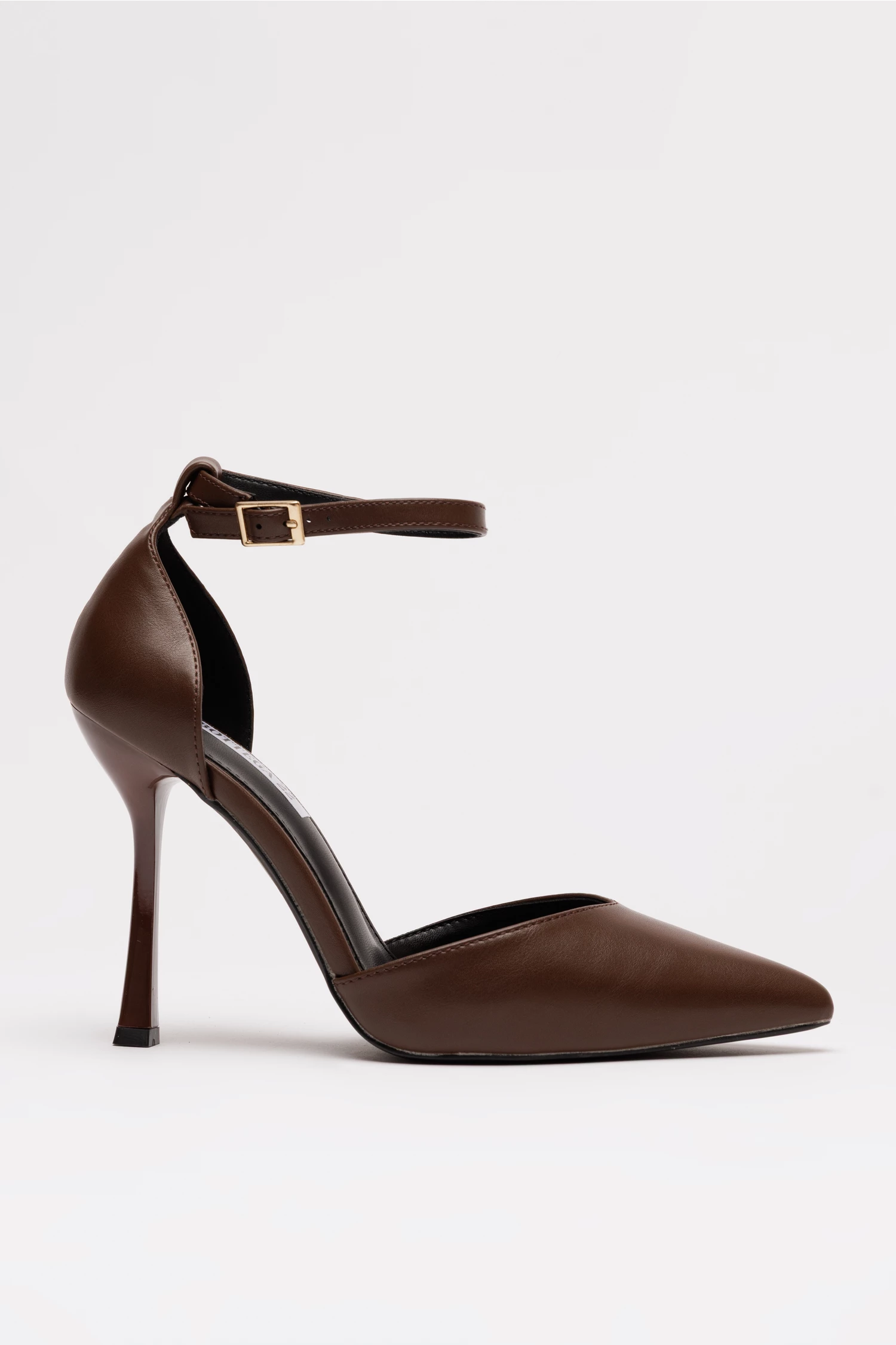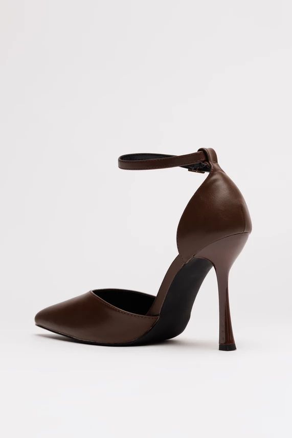 Pantofi eleganti maro din piele ecologica . Au varf ascutit, decupaje pe laterale si bareta reglabila la glezna.