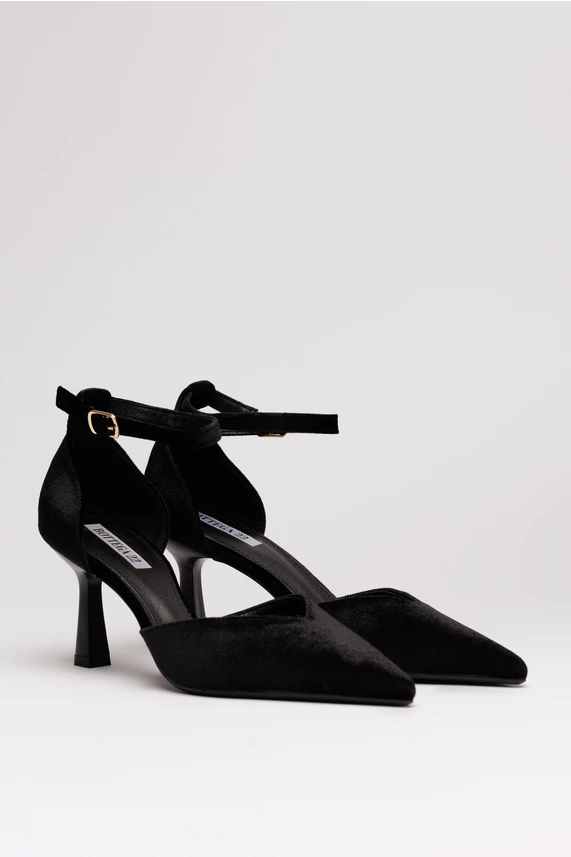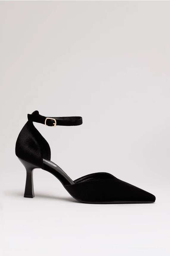 Pantofi eleganti din material catifelat. Au varf ascutit, toc jos si baretuta subtire la glezna.