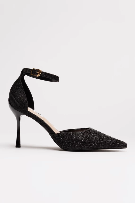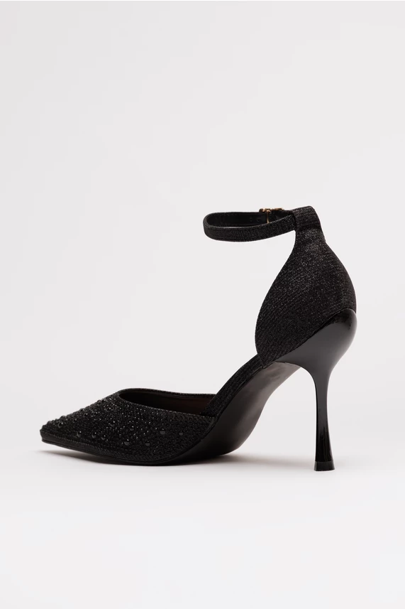 Pantofi de ocazie negri cu toc subtire si aplicatii stralucitoare. Au varf ascutit, decupaje pe lateral si bareta reglabila la glezna.