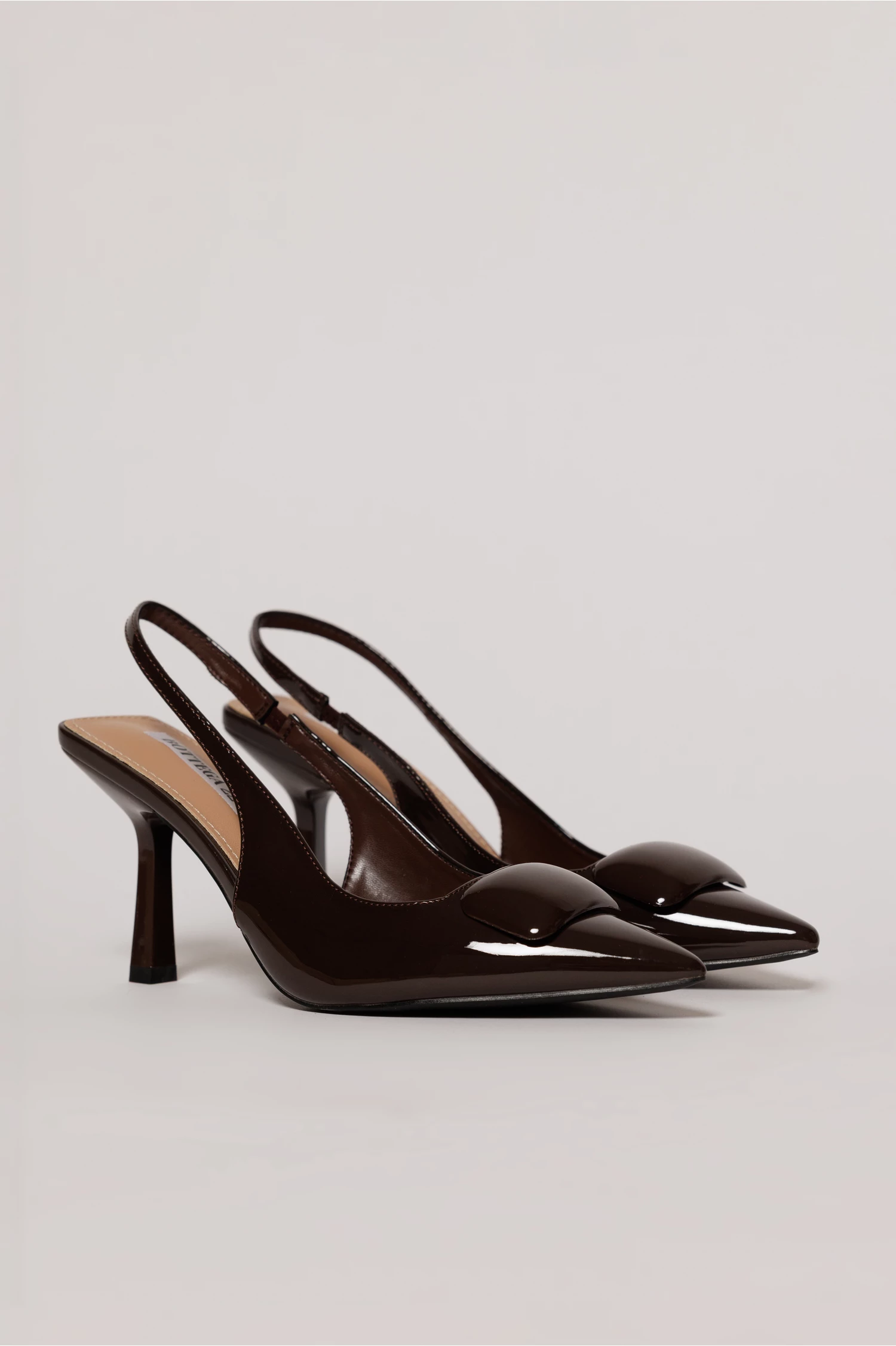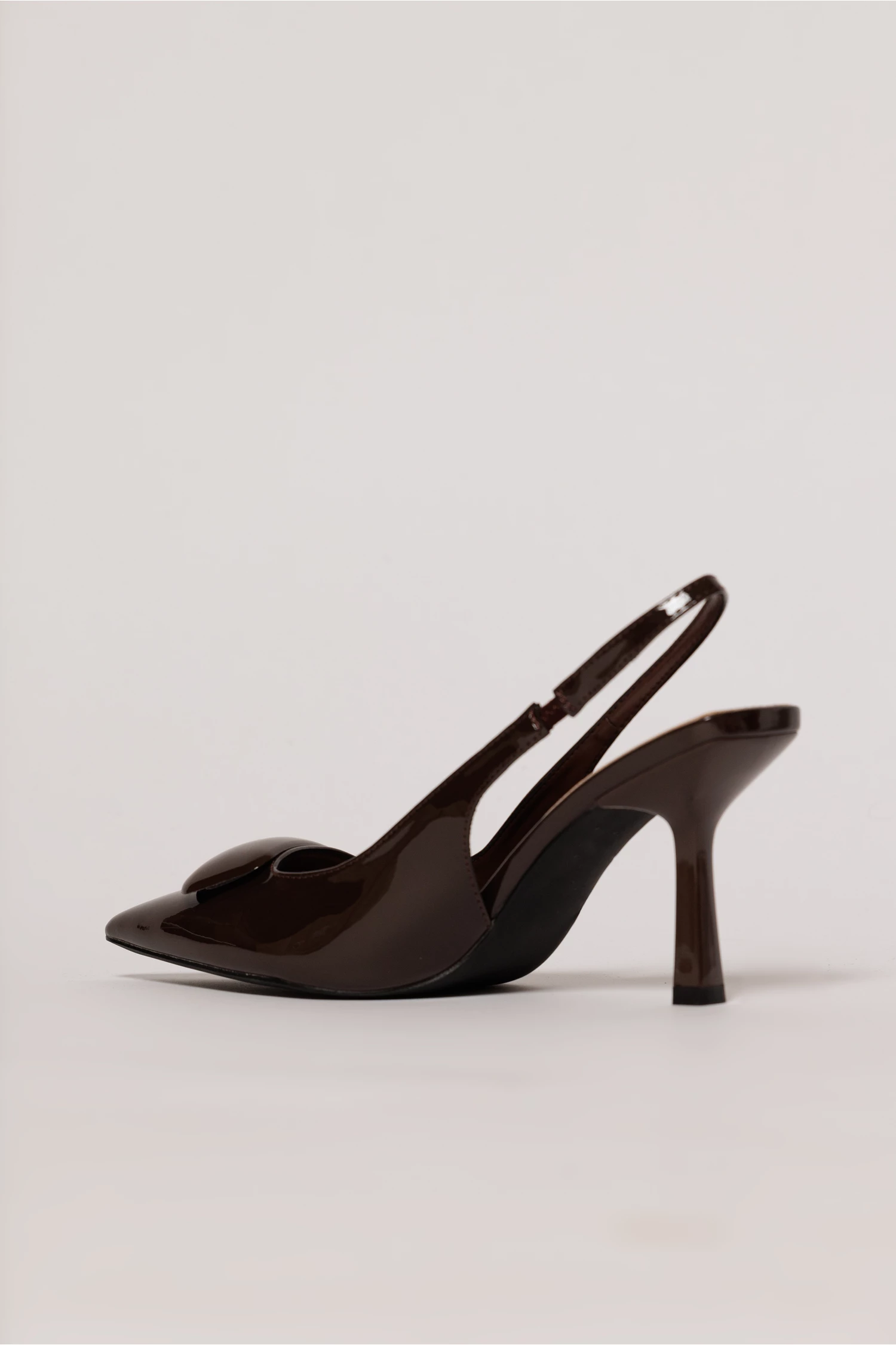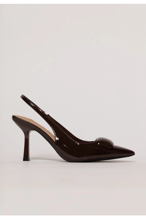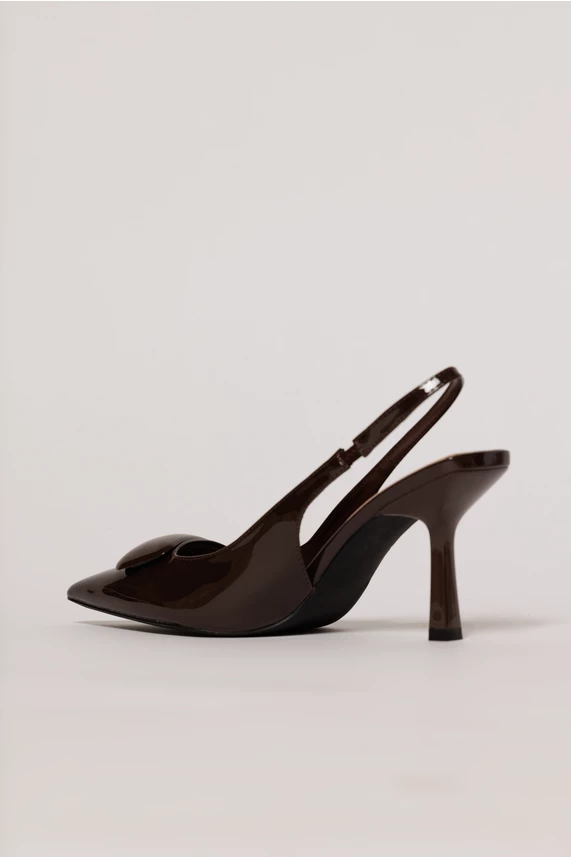 Pantofi maro cu varf ascutit si detaliu decorativ