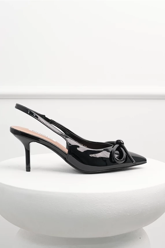 Pantofi din piele ecologica cu aspect lacuit si funda. Are varf ascutit, bareta cu elastic lateral si toc subtire.
