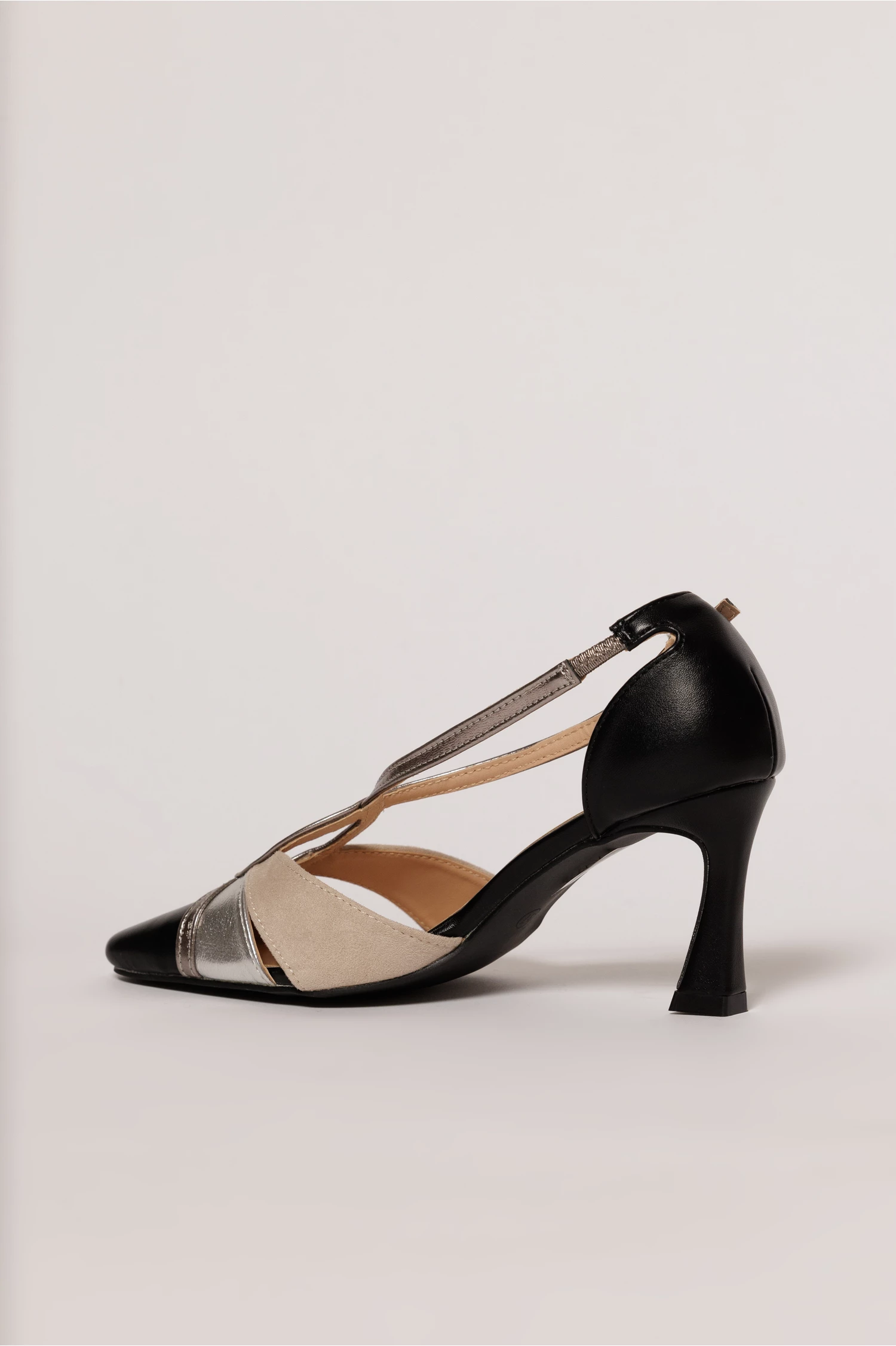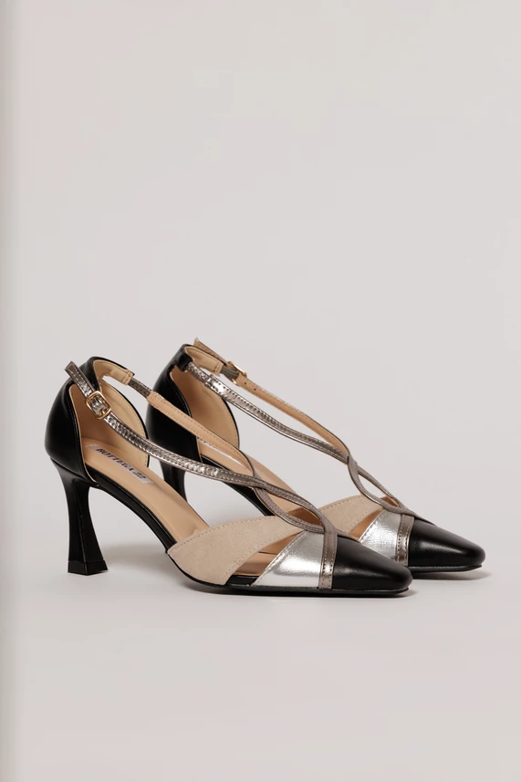 Pantofi eleganti in nuante de negru, bej si argintiu. Are barete subtiri incrucisate, toc subtire stabil si se inchide cu catarama.