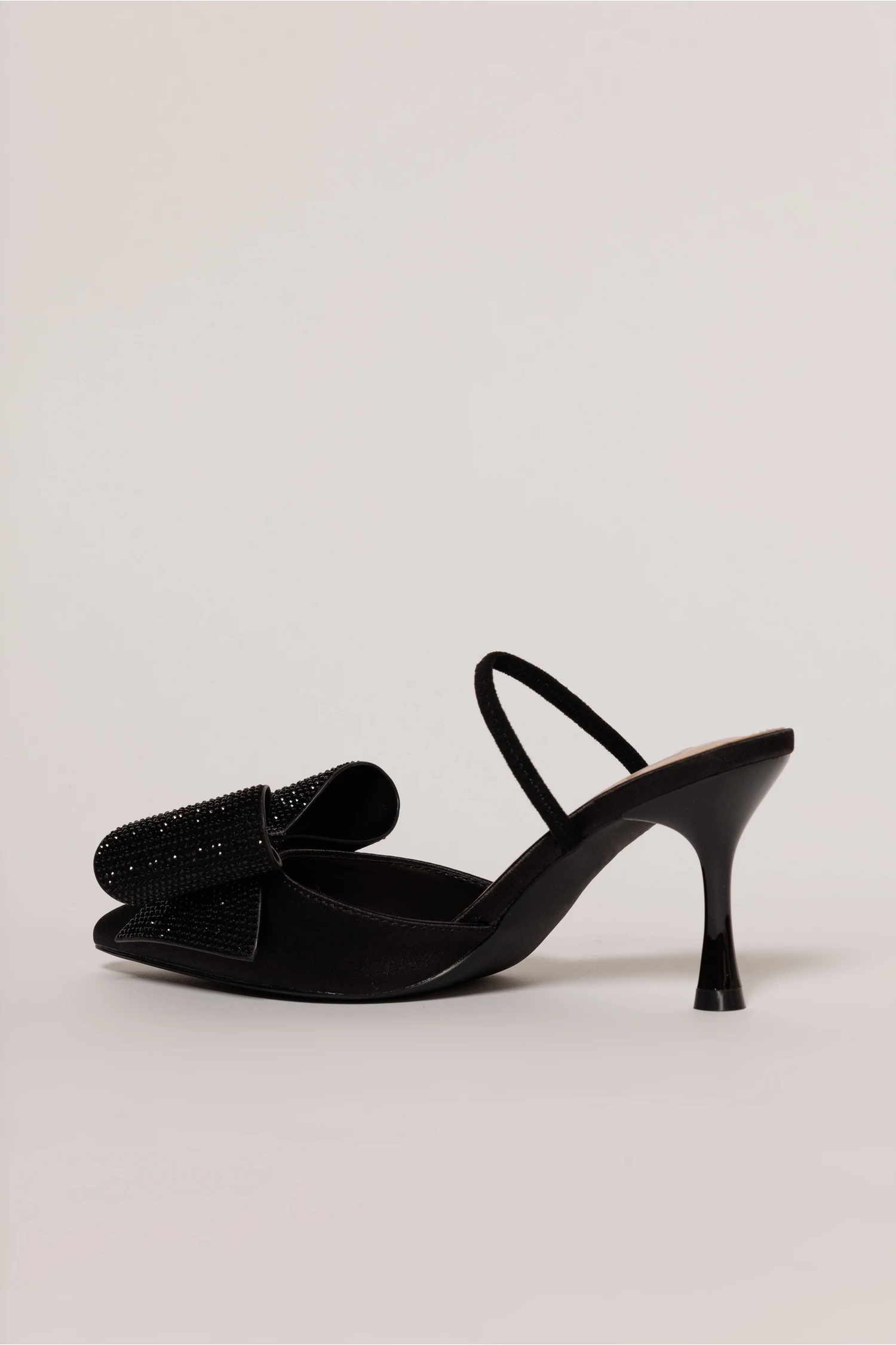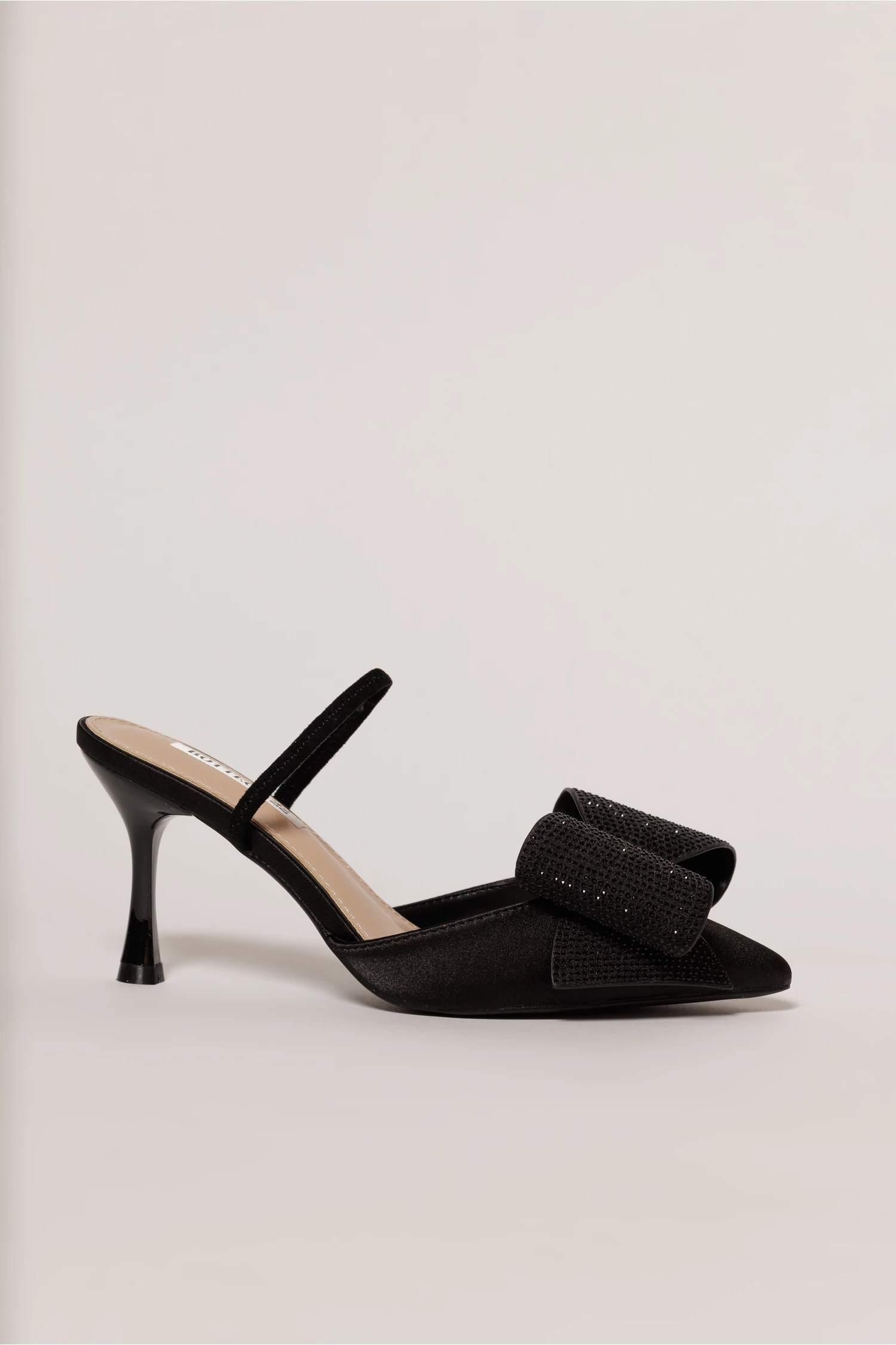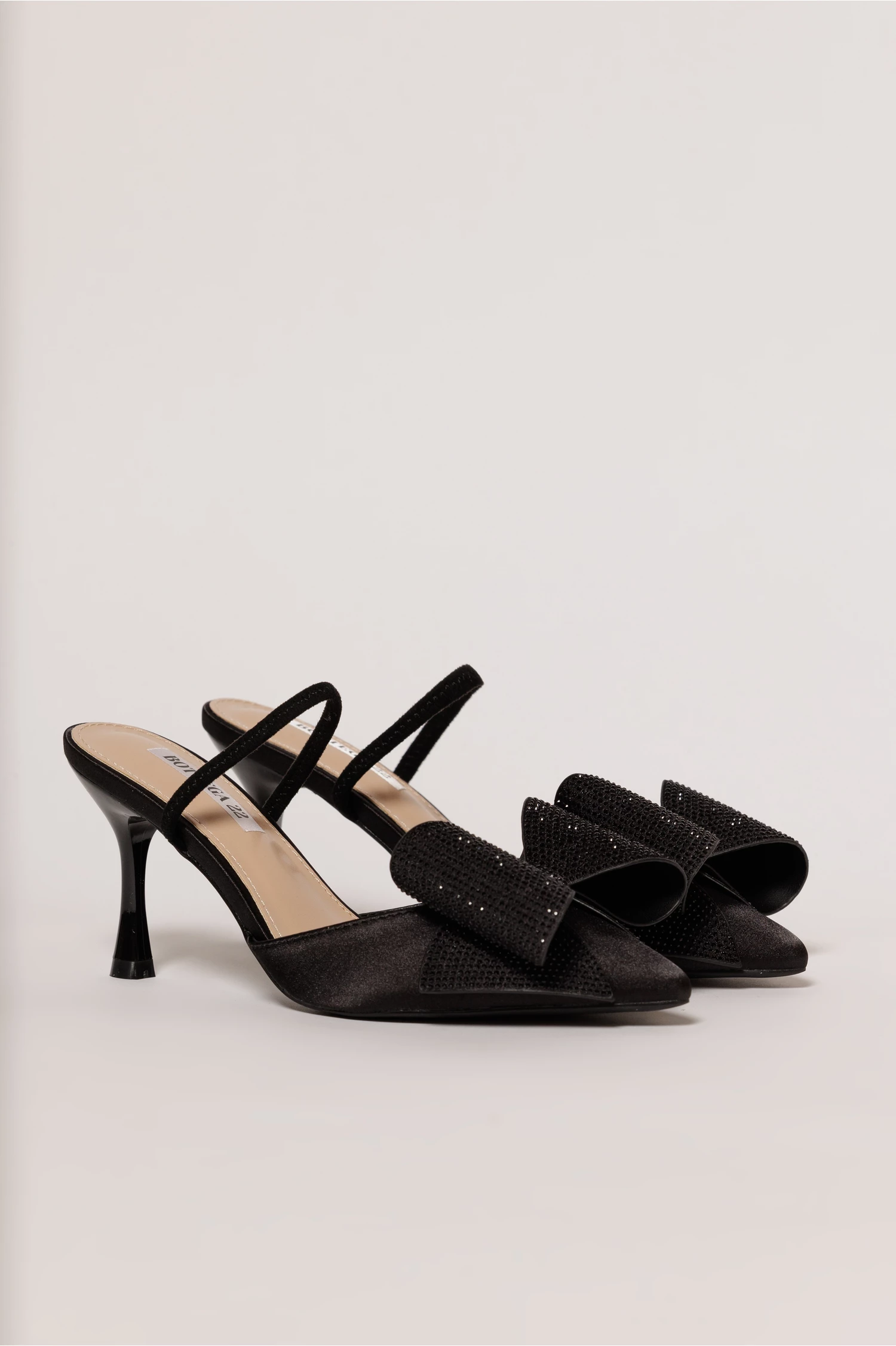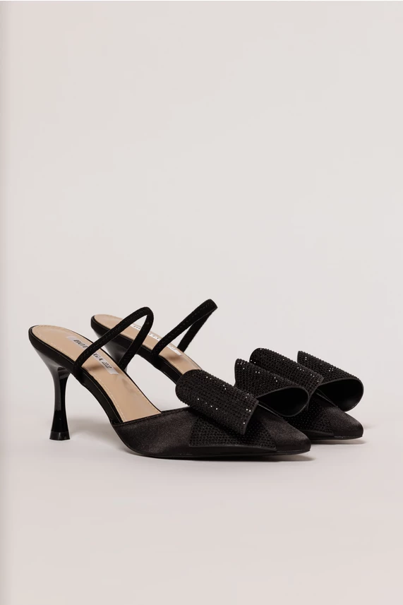 Pantofi eleganti din material satinat cu funda maxi cu pietre stralucitoare. Au varf ascutit si toc inalt.