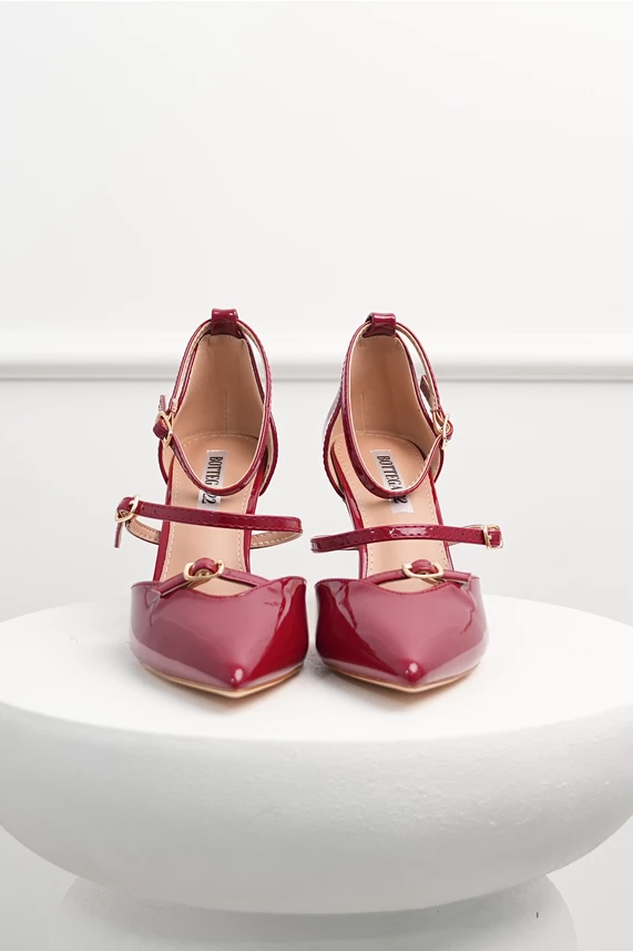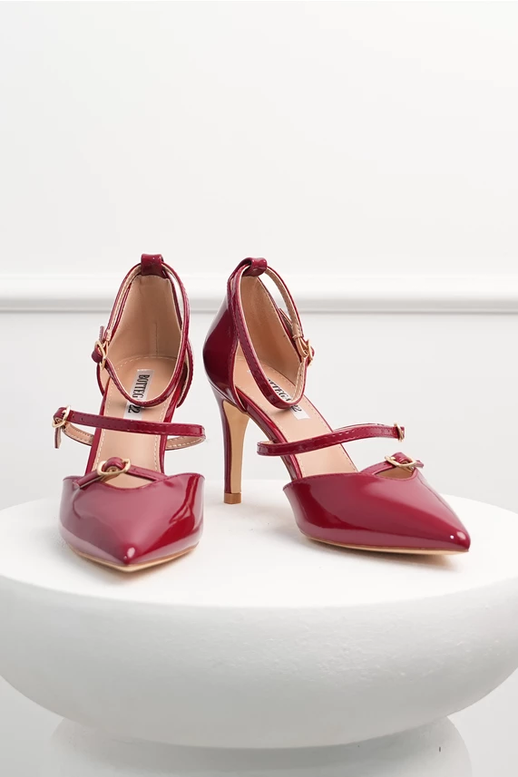 Pantofi eleganti din piele ecologica cu aspect lacuit. Au varf ascutit, toc subtire si barete reglabile.