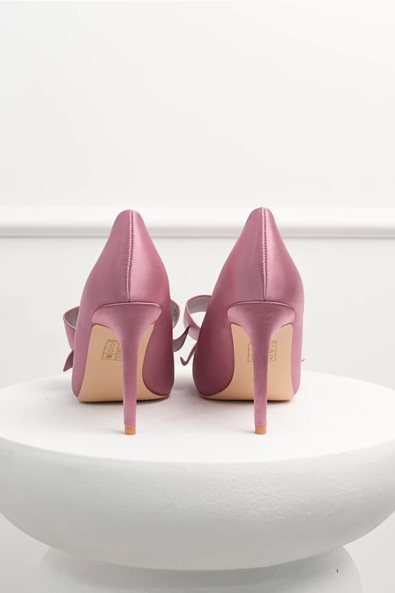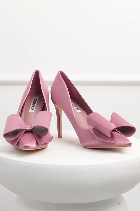 Pantofi eleganti din material satinat cu funda maxi. Au varf ascutit si toc inalt.