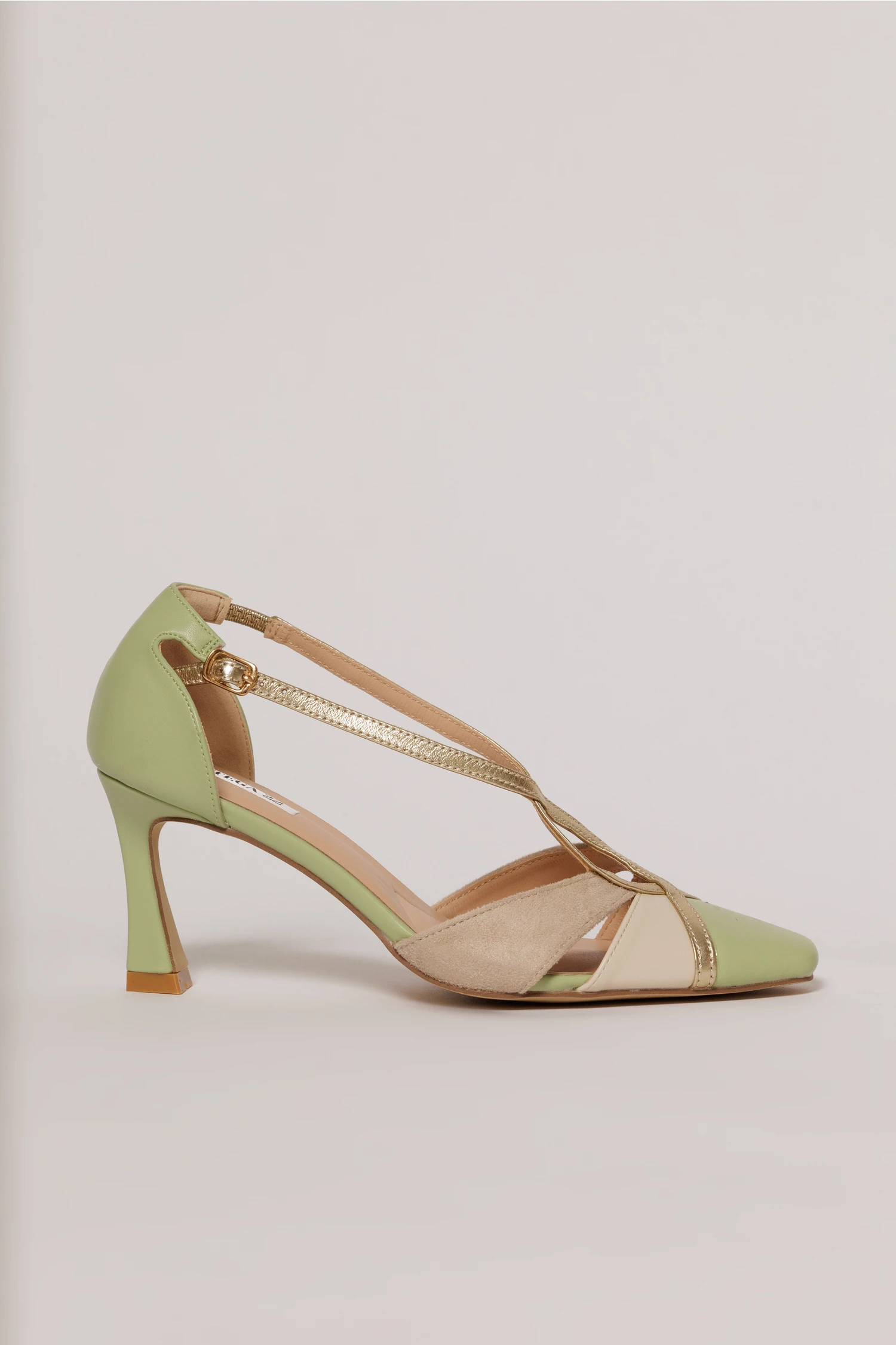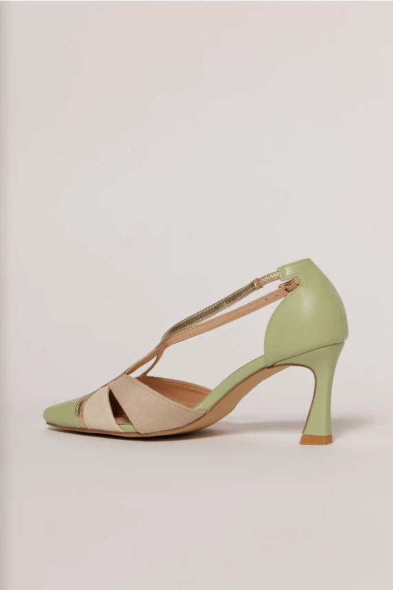 Pantofi eleganti in nuante de verde menta, bej si auriu. Are barete subtiri incrucisate, toc subtire stabil si se inchide cu catarama.