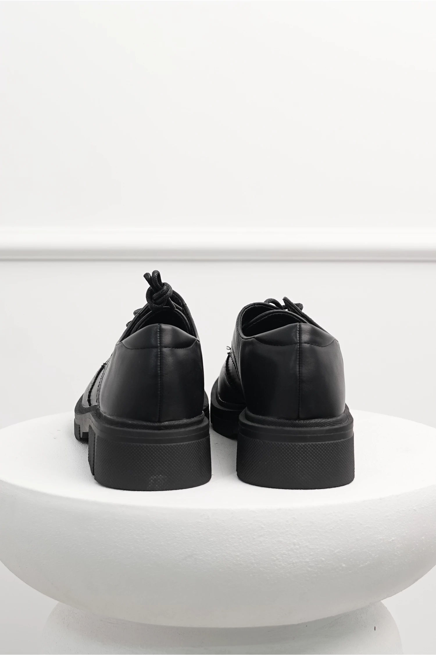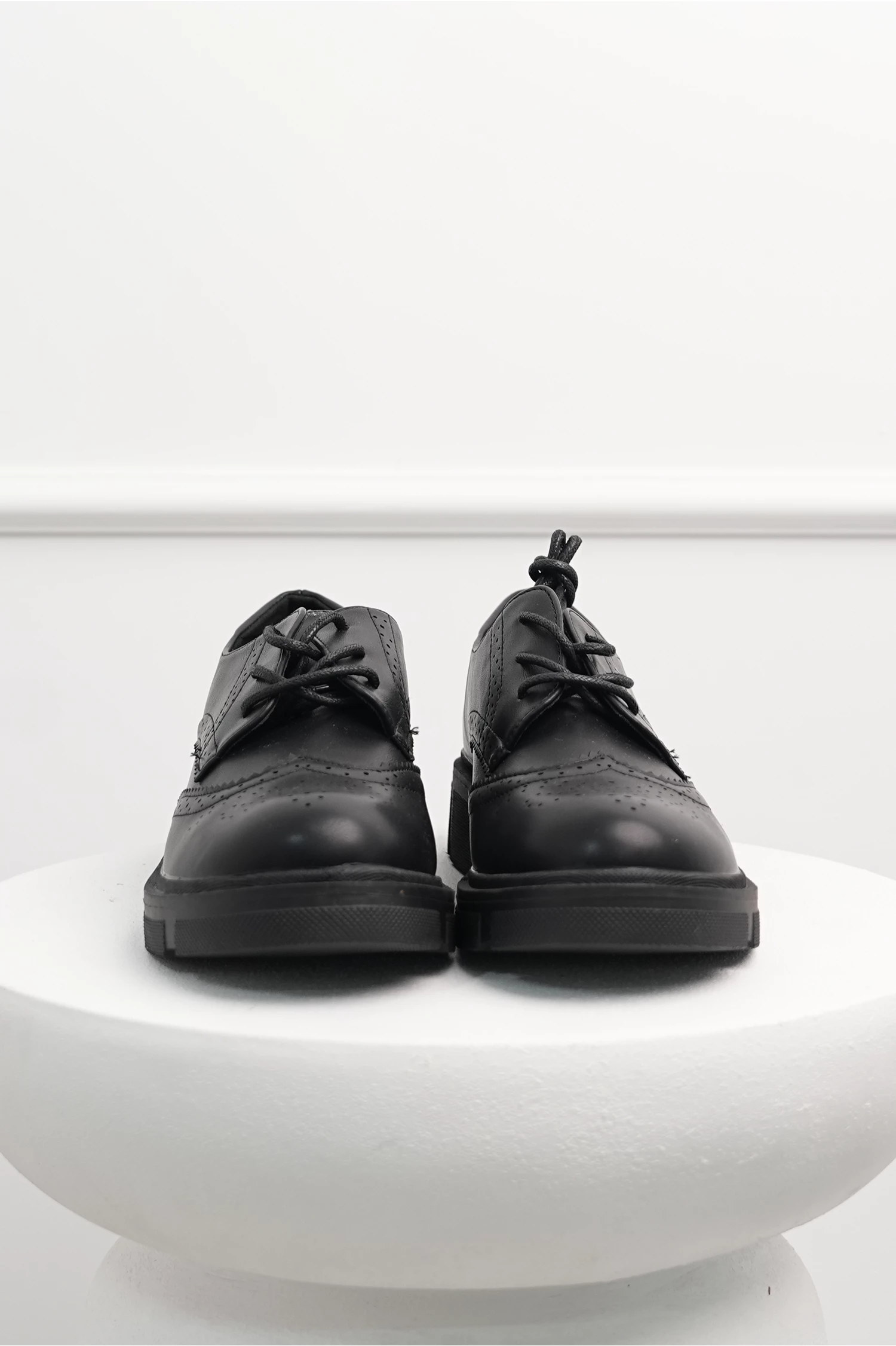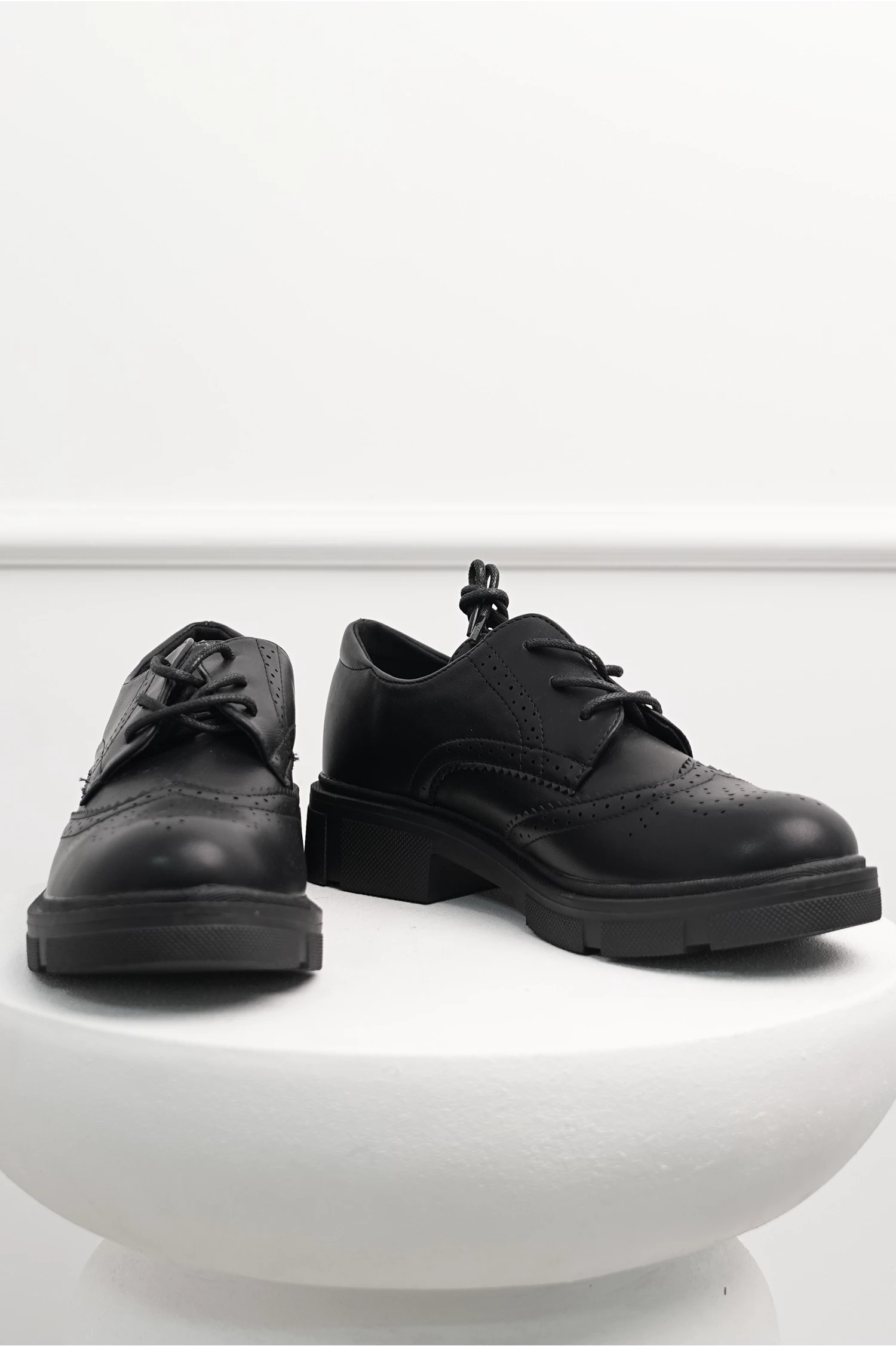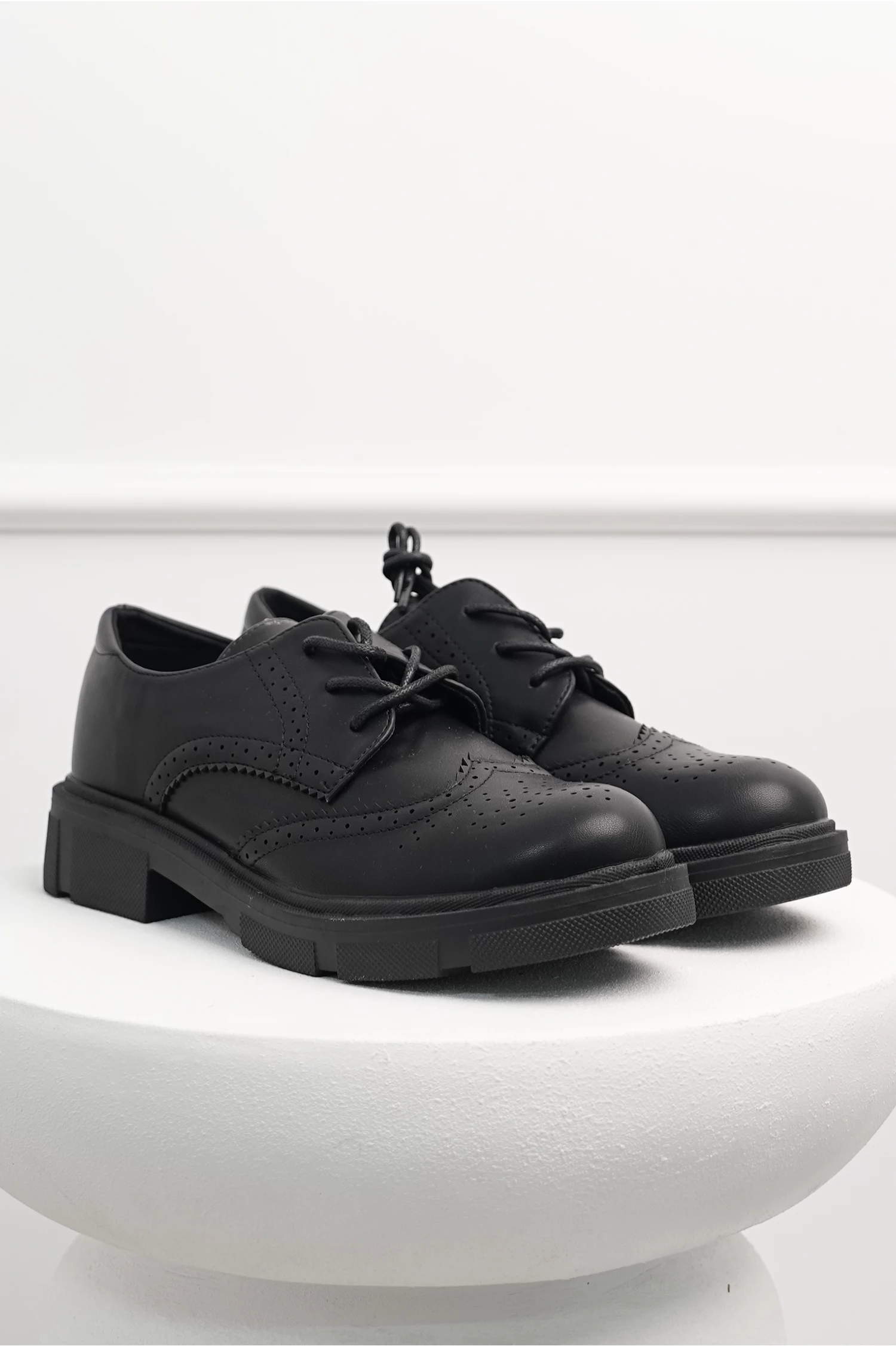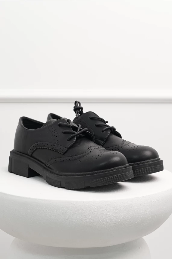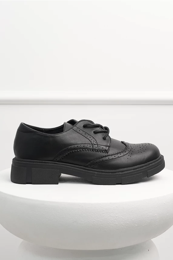 Pantofi Oxford din piele ecologica cu model perforat. Au varf rotund, talpa gorasa si se lega cu siret.