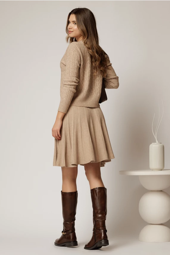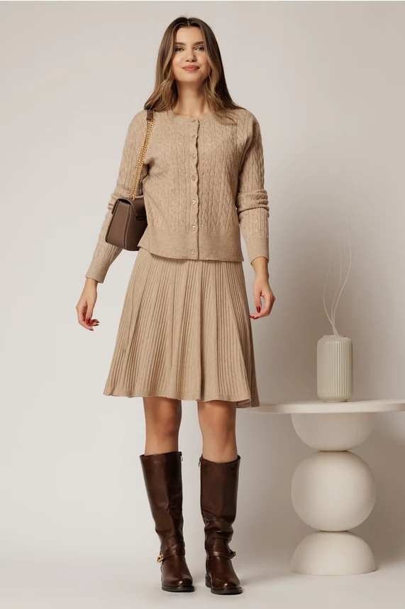 Este un pulover elegant bej, din tricot, cu inchidere cu nasturi, potrivit pentru zilele racoroase.