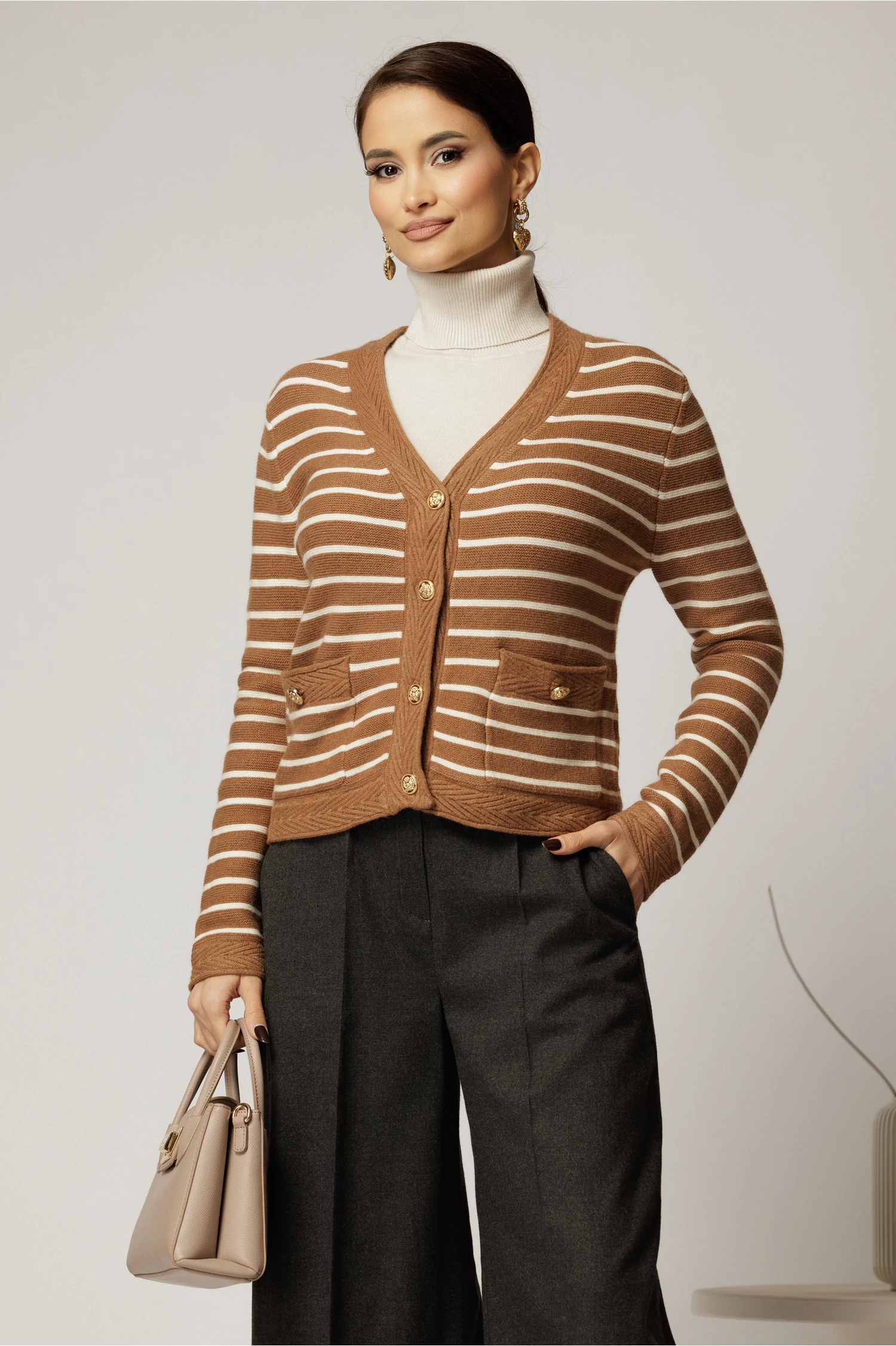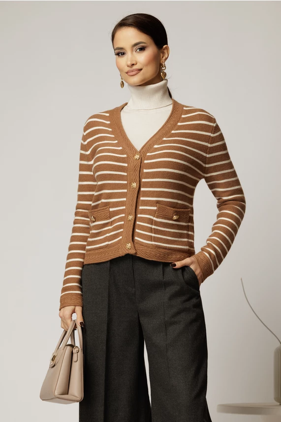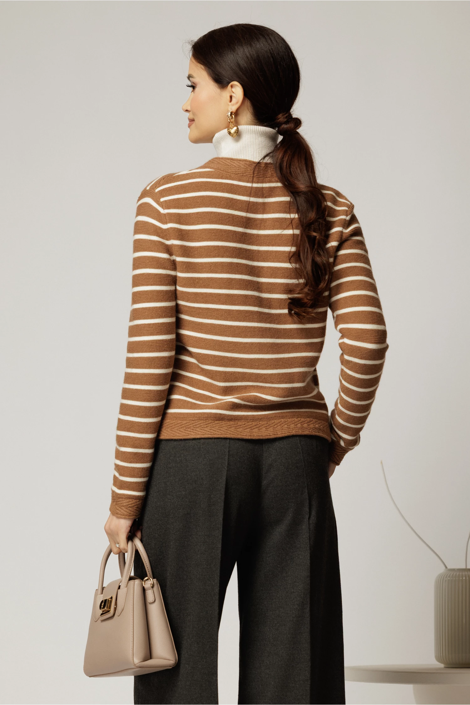 Este un pulover elegant, in nuante de maro cu dungi albe, usor de purtat si asortat unei tinute. Puloverul ete scurt si se inchide cu nasturi.