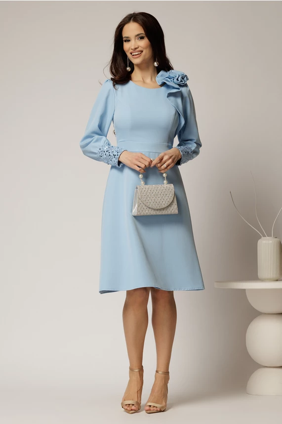 Este o rochie eleganta de ocazie, bleu, cu mansetele din paiete care ofera un plus de eleganta. Rochia este accesorizata cu o funda in forma de floare, are decolteul rotund si fusta tip A.