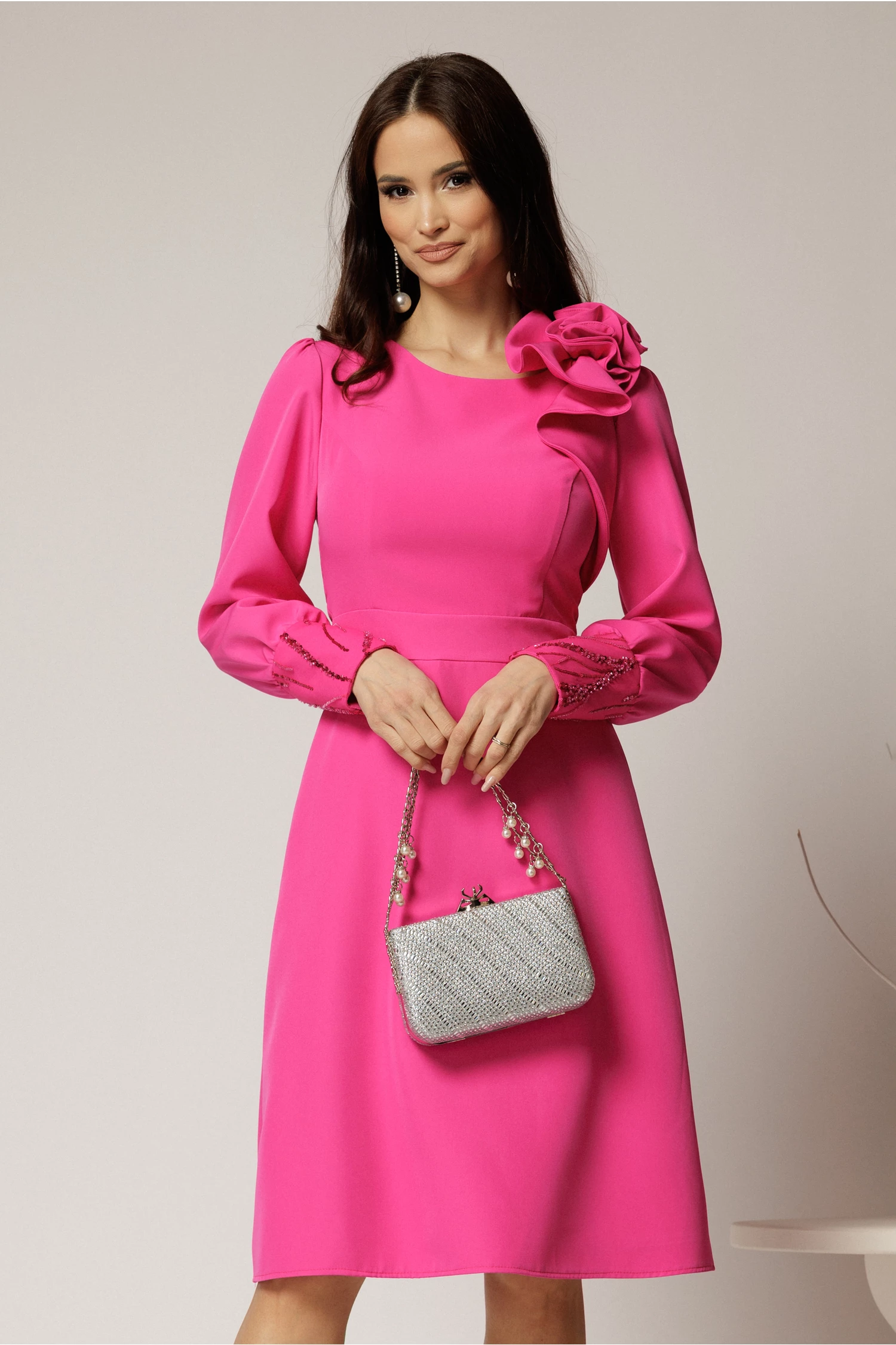 Rochia DY Fashion fucsia cu mansete din paiete si funda ampla pe umar