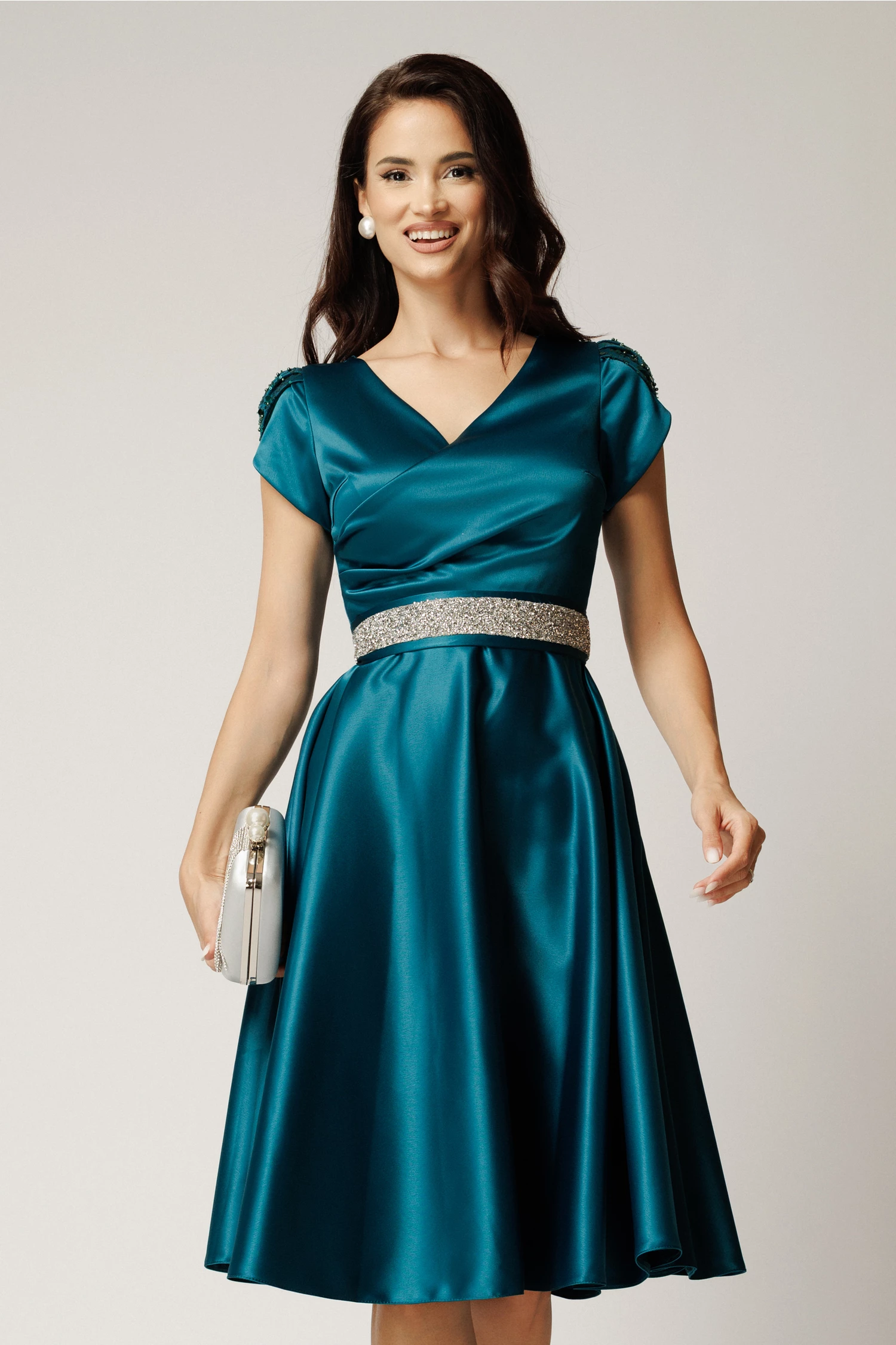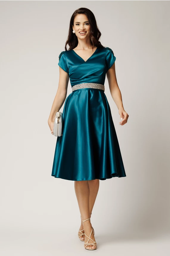 Rochie Amira midi verde petrol din tafta cu paiete pe maneci si cordon in talie