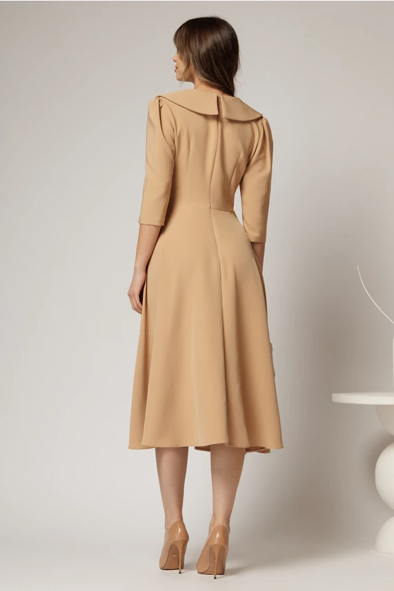 Rochie bej clos de ocazie cu guler maxi si nasturi perluta