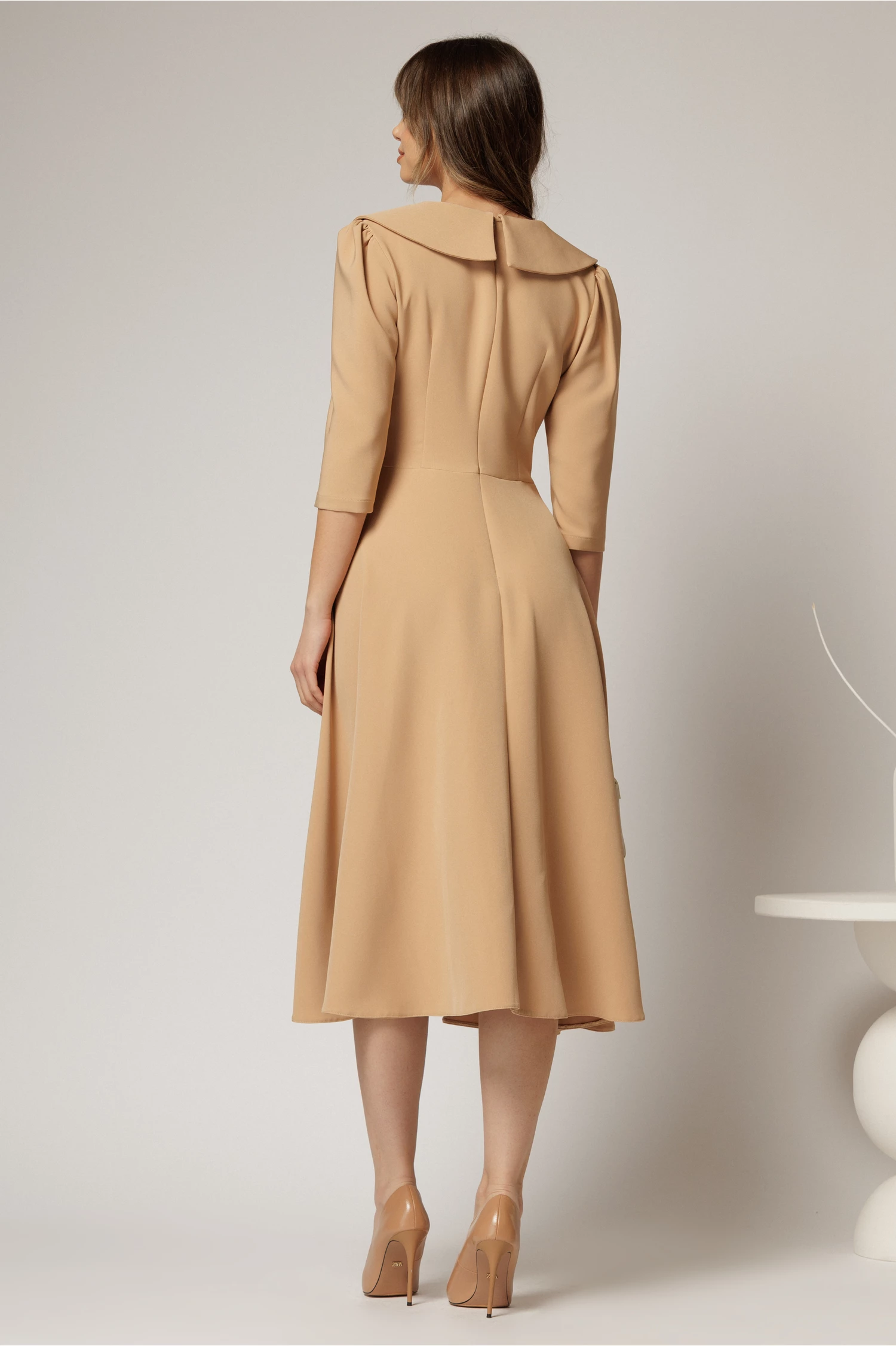 Adopta un look diafan, imbracand o rochie bej de lungime midi, al carei croi clos avantajeaza orice silueta. Rochia este accesorizata cu nasturi eleganti cu perla si un guler maxi cu design deosebit.