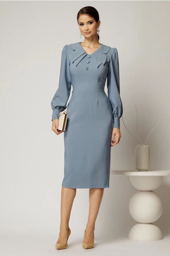 Este o rochie conica bleu, al carei bust este accesorizat cu nasturi imbracati si guler dublu. Rochia este potrivita atat pentru intalnirile office cat si pentru evenimente speciale.