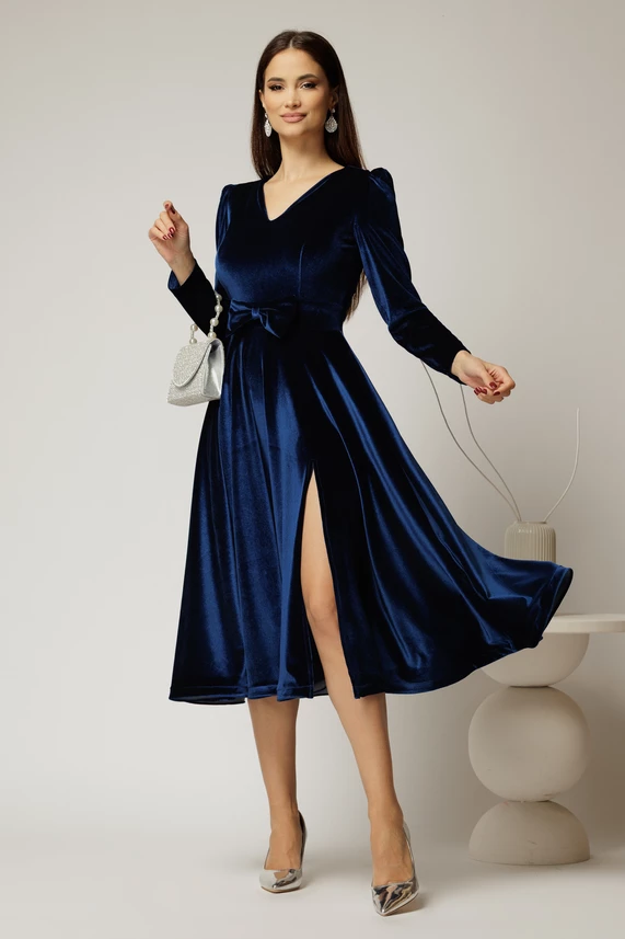 Este o rochie jucausa si eleganta, de culoare bleumarin, din catifea. Rochia are decolteu in V, crapatura pe picior si rijelina la fusta, iar talia este accesorizata cu o funda.