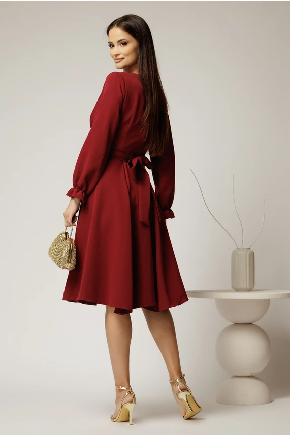 Este o rochie midi bordo versatila, pe care o poti purta la un eveniment sau la birou. Rochie are decolteu petrecut, cordon cu catarama in talie si fusta clos.