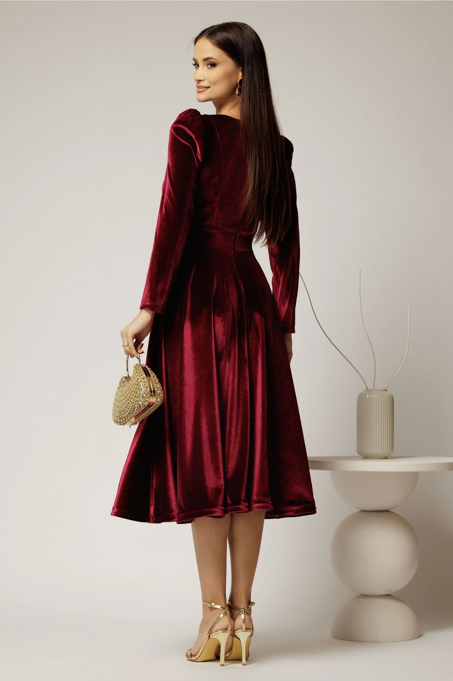 Este o rochie jucausa si eleganta, de culoare bordo, din catifea. Rochia are decolteu in V, crapatura pe picior si rijelina la fusta, iar talia este accesorizata cu o funda.