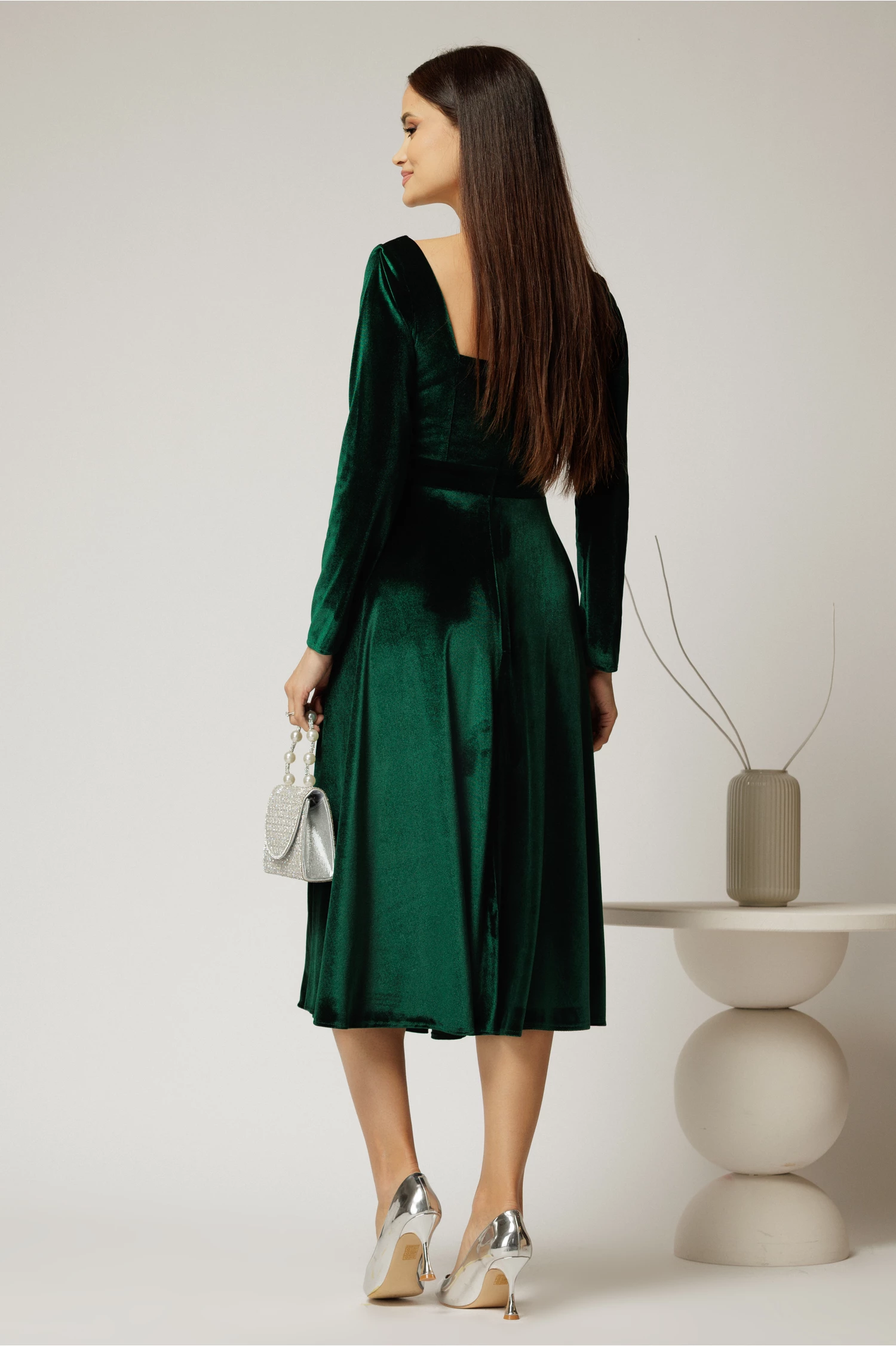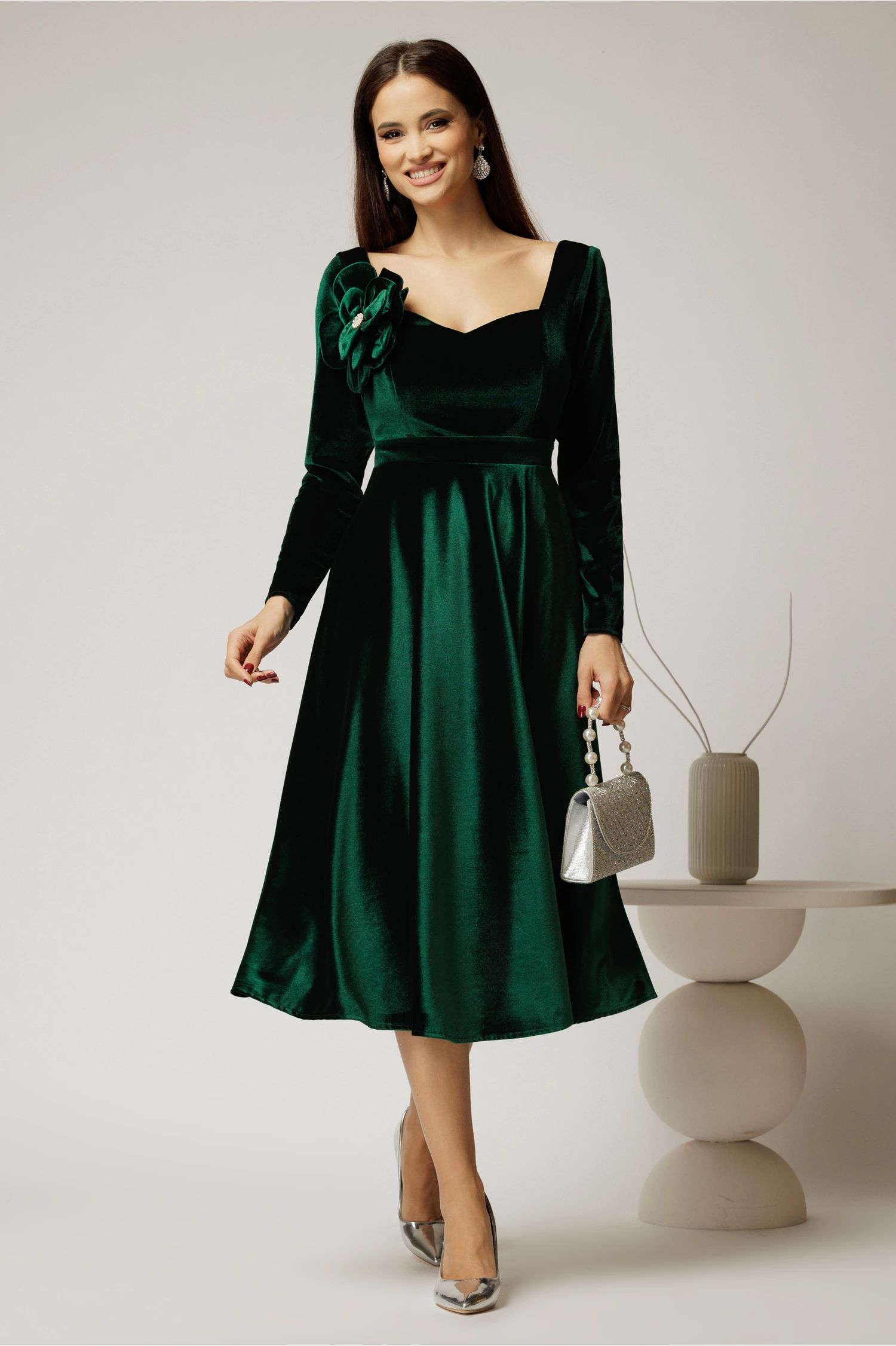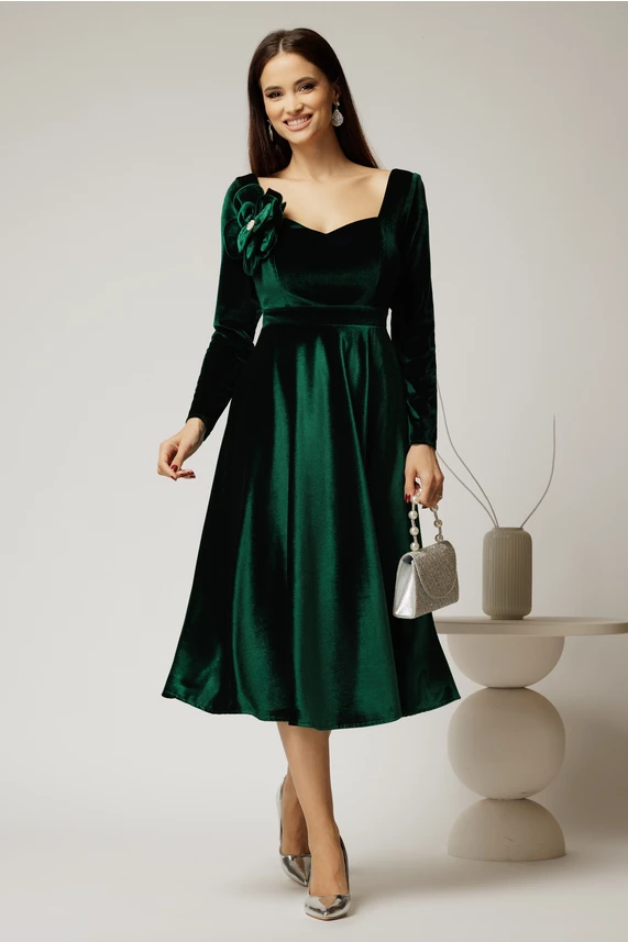 Rochie DY Fashion din catifea verde cu decolteu inima si accesoriu la bust