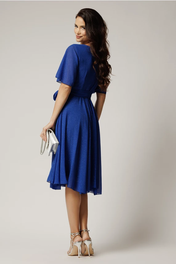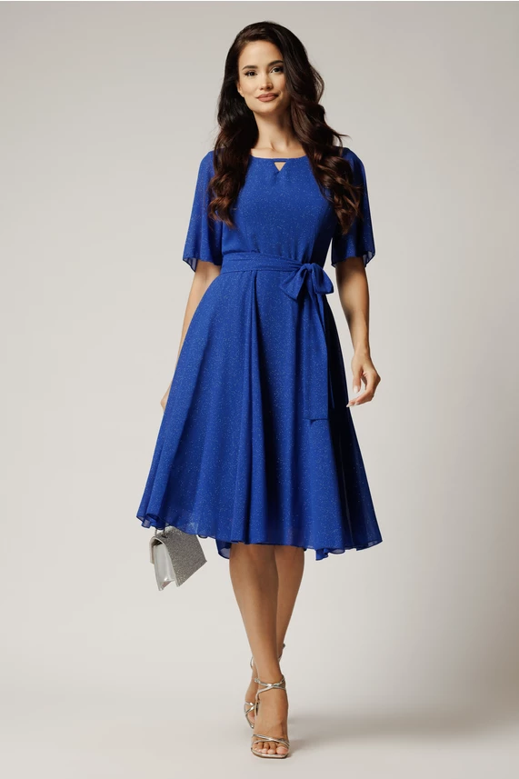 Rochie DY Fashion midi albastra din voal in clos cu glitter si cordon in talie