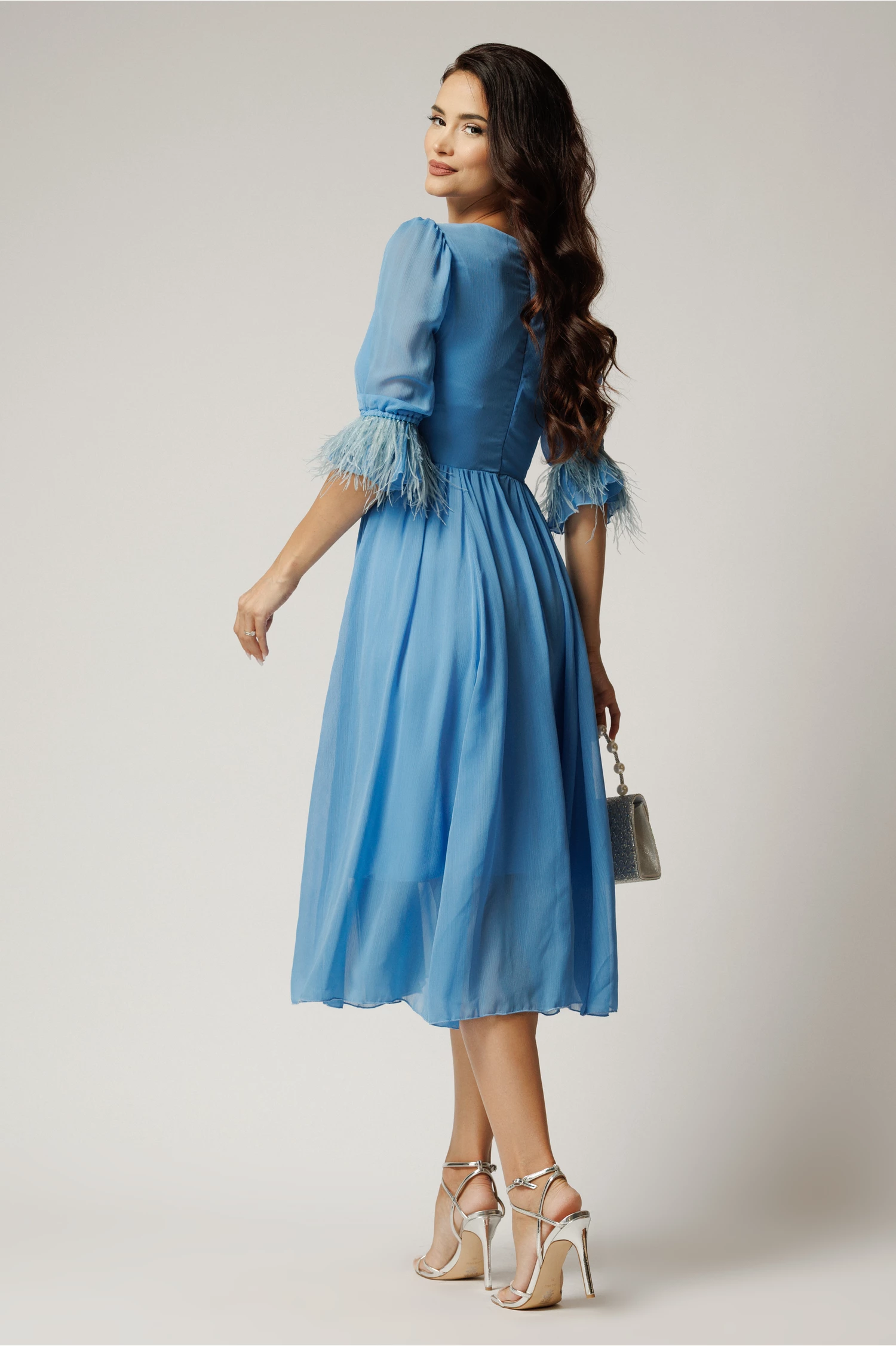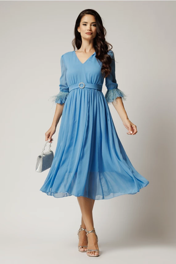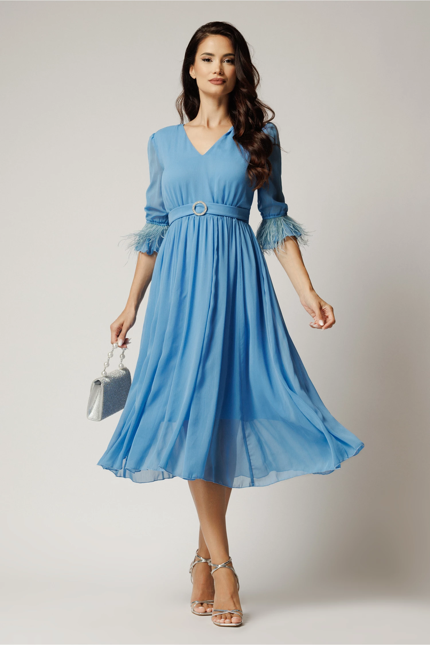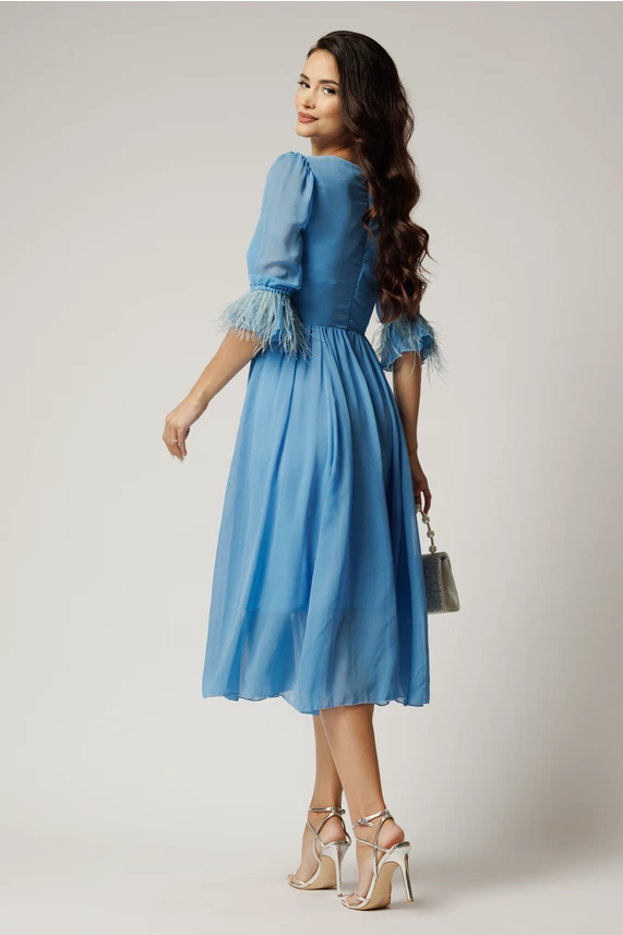 Rochie DY Fashion midi bleu din voal in clos cu pene la maneci si accesoriu in talie
