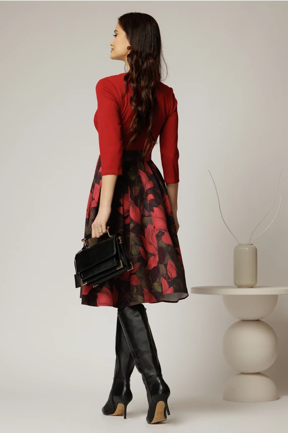 Este o rochie midi de zi cu fusta cu pliuri si imprimeuri. Rochia are un decupaj discret la decolteu si maneci trei sferturi.