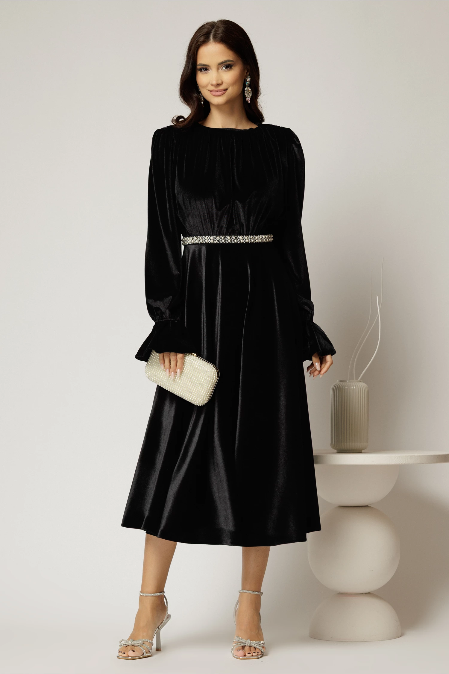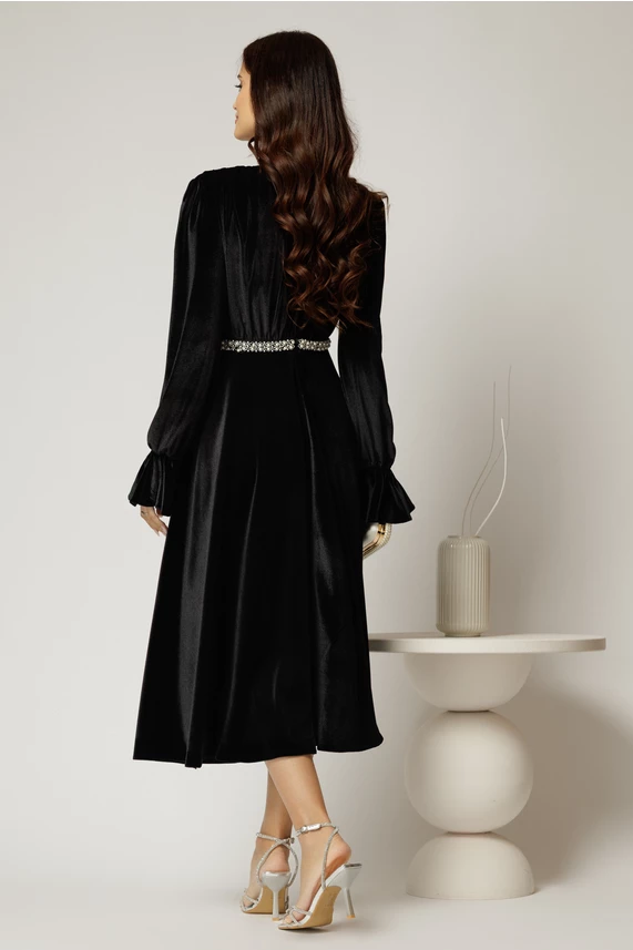 Rochie DY Fashion midi neagra din catifea cu perle pe talie