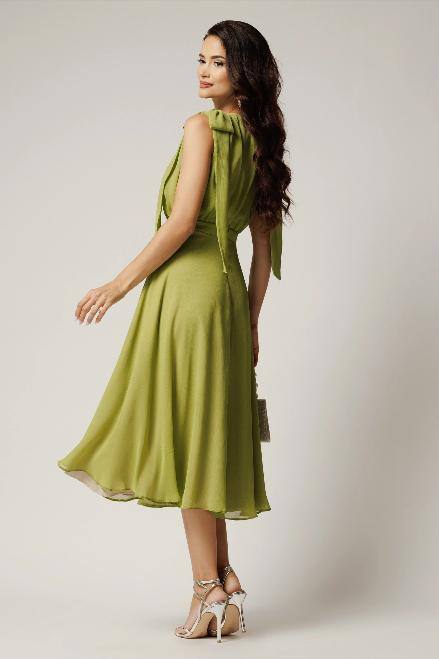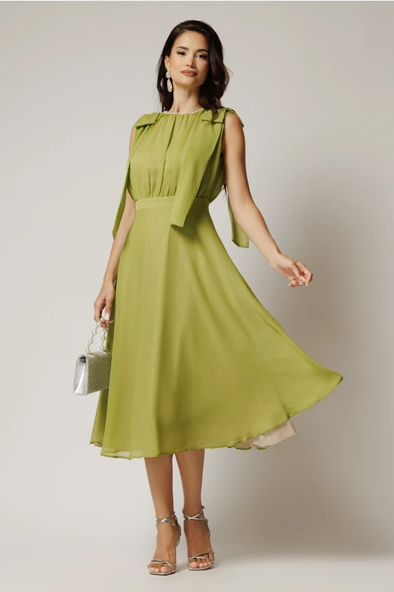 Rochie DY Fashion midi verde fistic din voal in clos cu funde la umeri