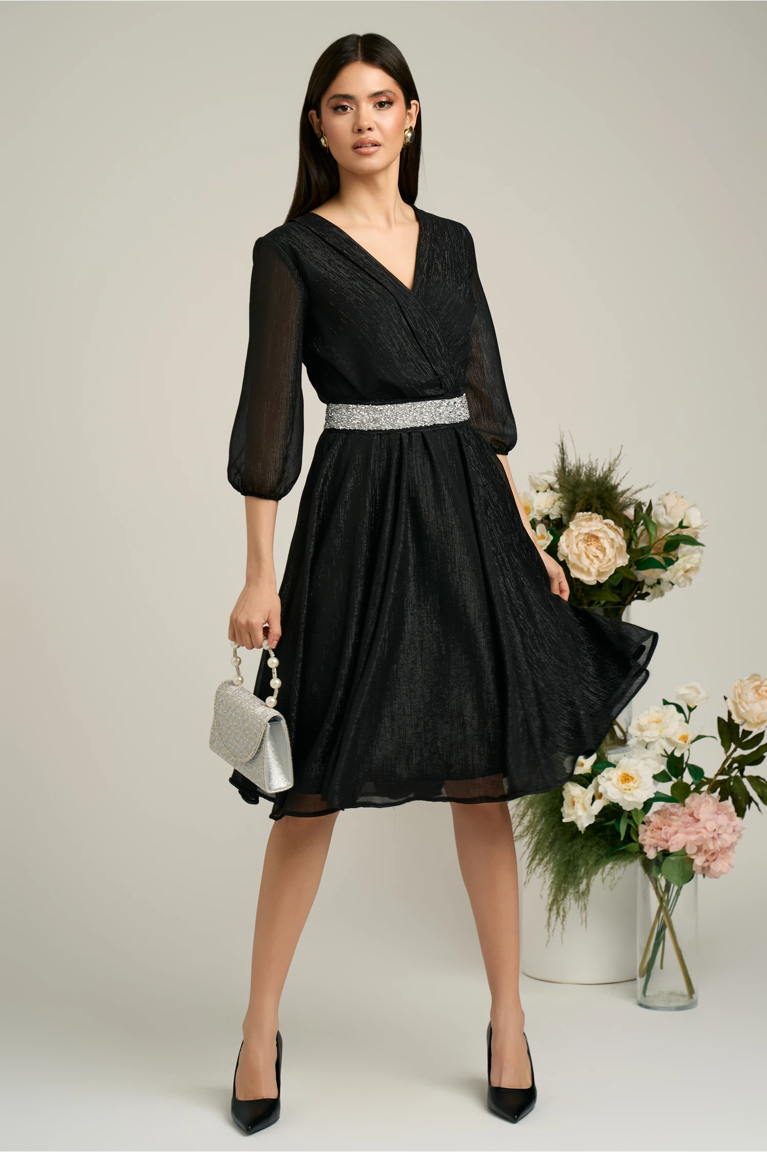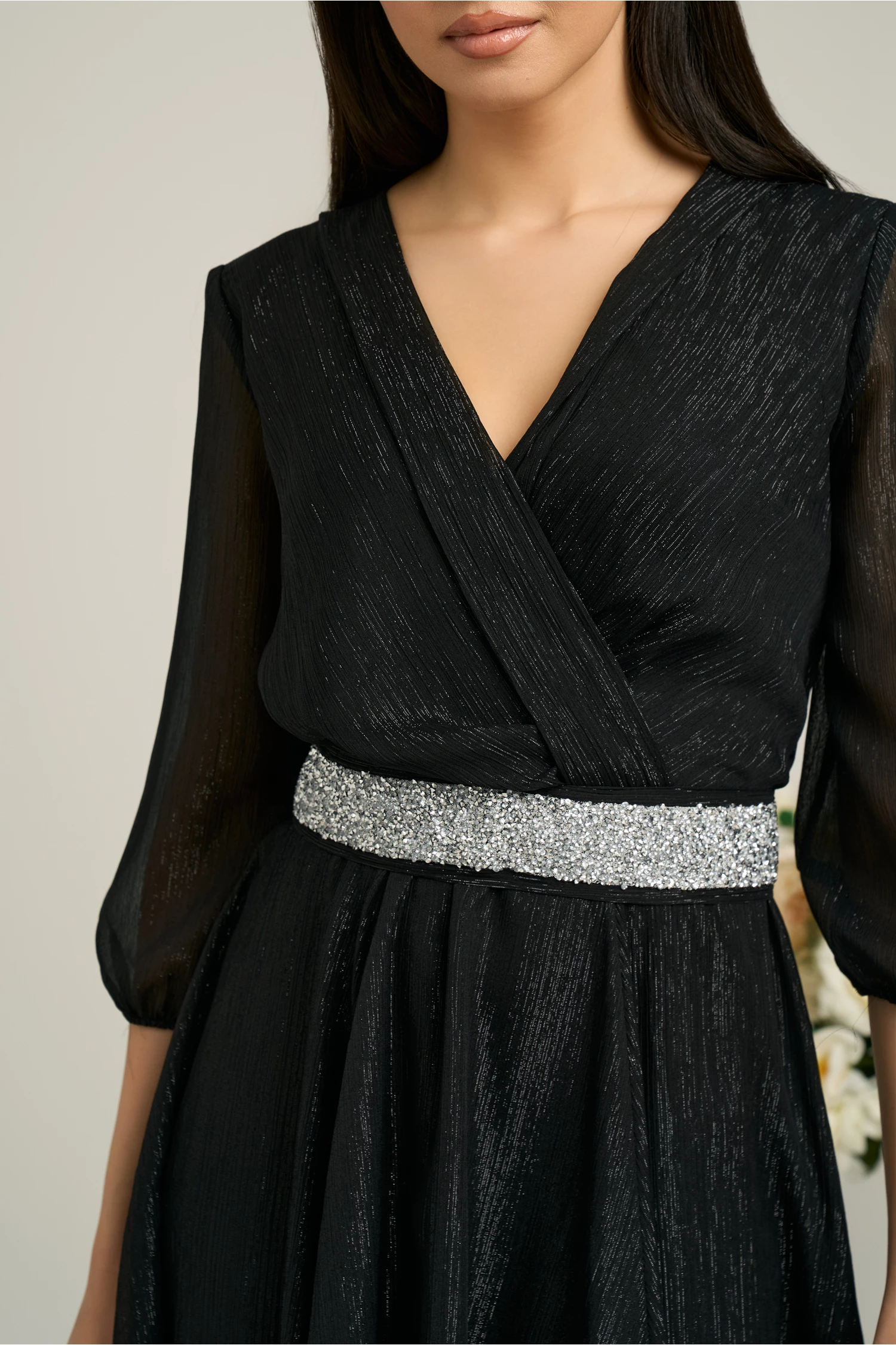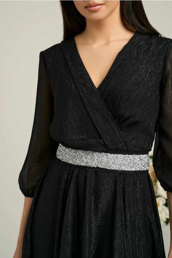 Este o superba rochie de ocazie, de culoare neagra, care te va pune in evidenta prin firul stralucitor din voalul rochiei, cordon in talie cu detalii argintii si decolteu adanc in V.