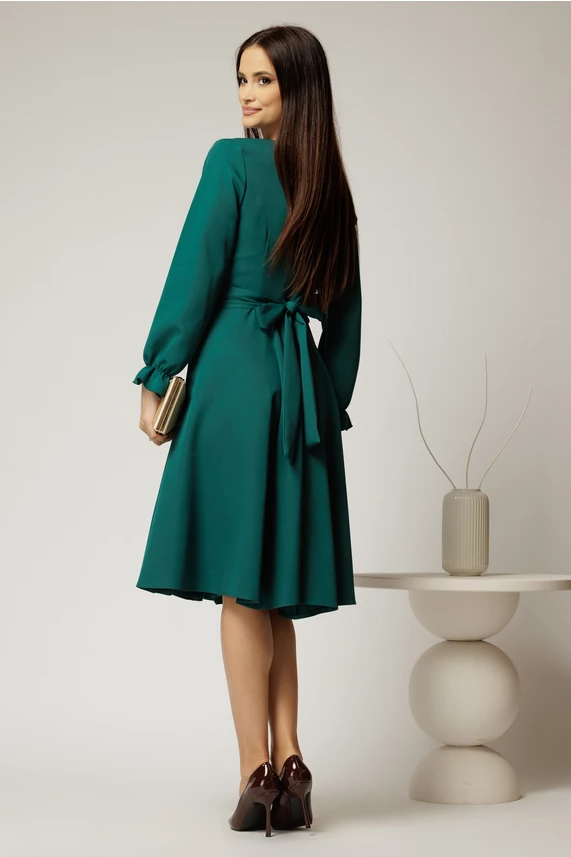 Este o rochie midi verde versatila, pe care o poti purta la un eveniment sau la birou. Rochie are decolteu petrecut, cordon cu catarama in talie si fusta clos.